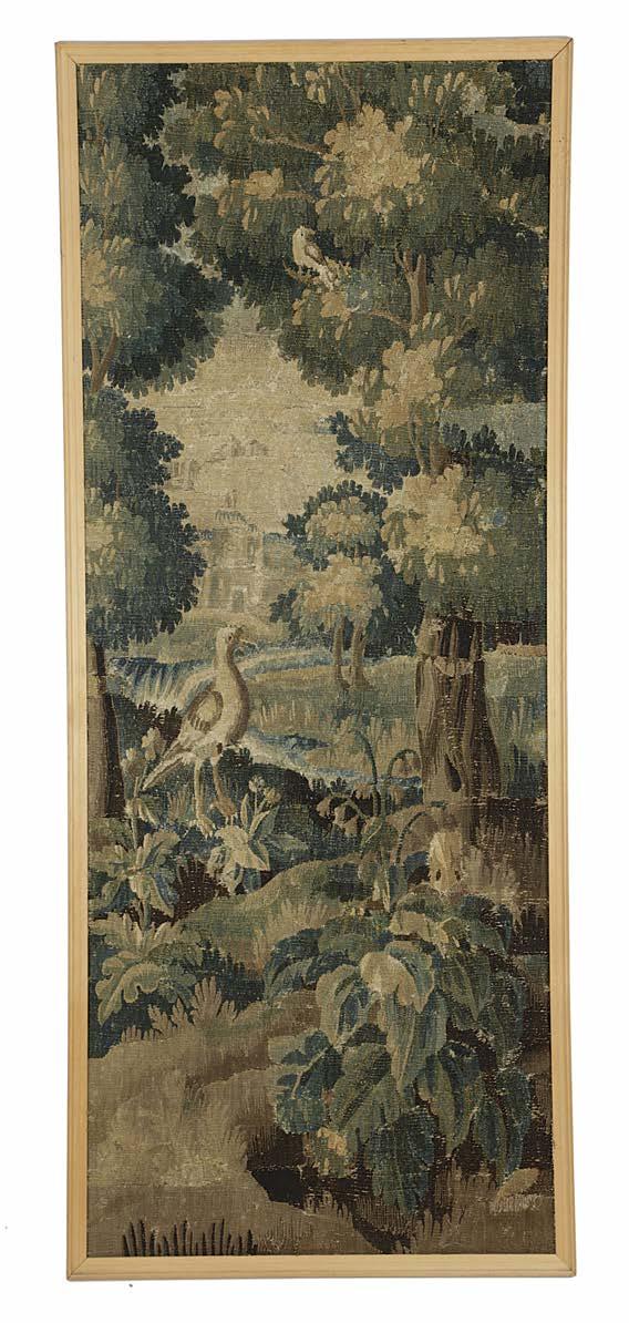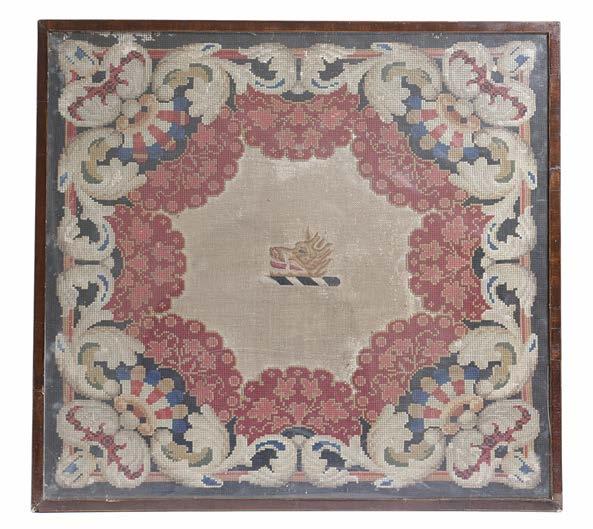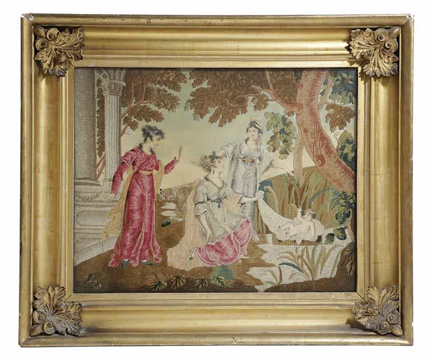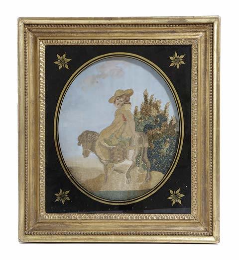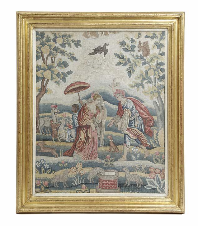 worked with coloured wools and silk on a canvas ground in petit point, with a romantic courtly couple and their attendant in a rural setting, flanked by trees and surrounded by domestic and wild animals including: three camels in the background, in a later glazed giltwood frame 45 x 35.5cm