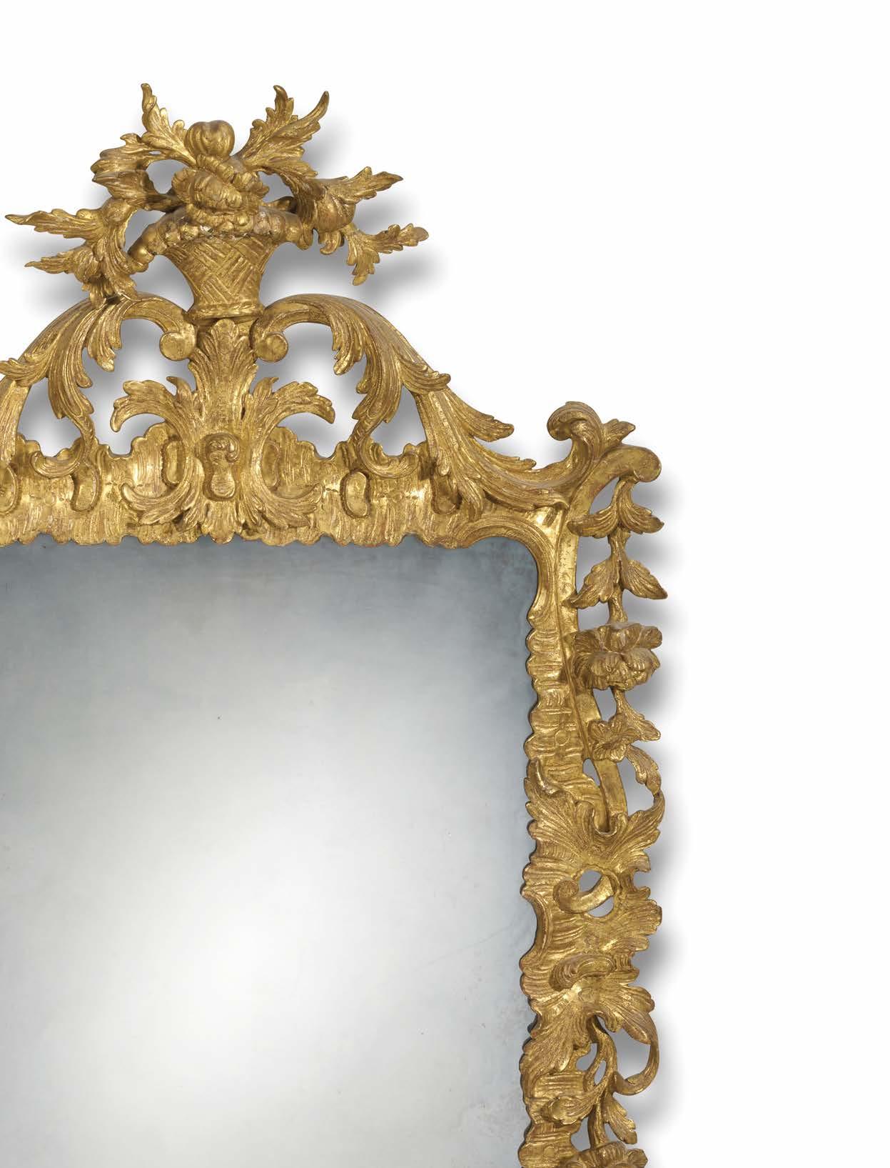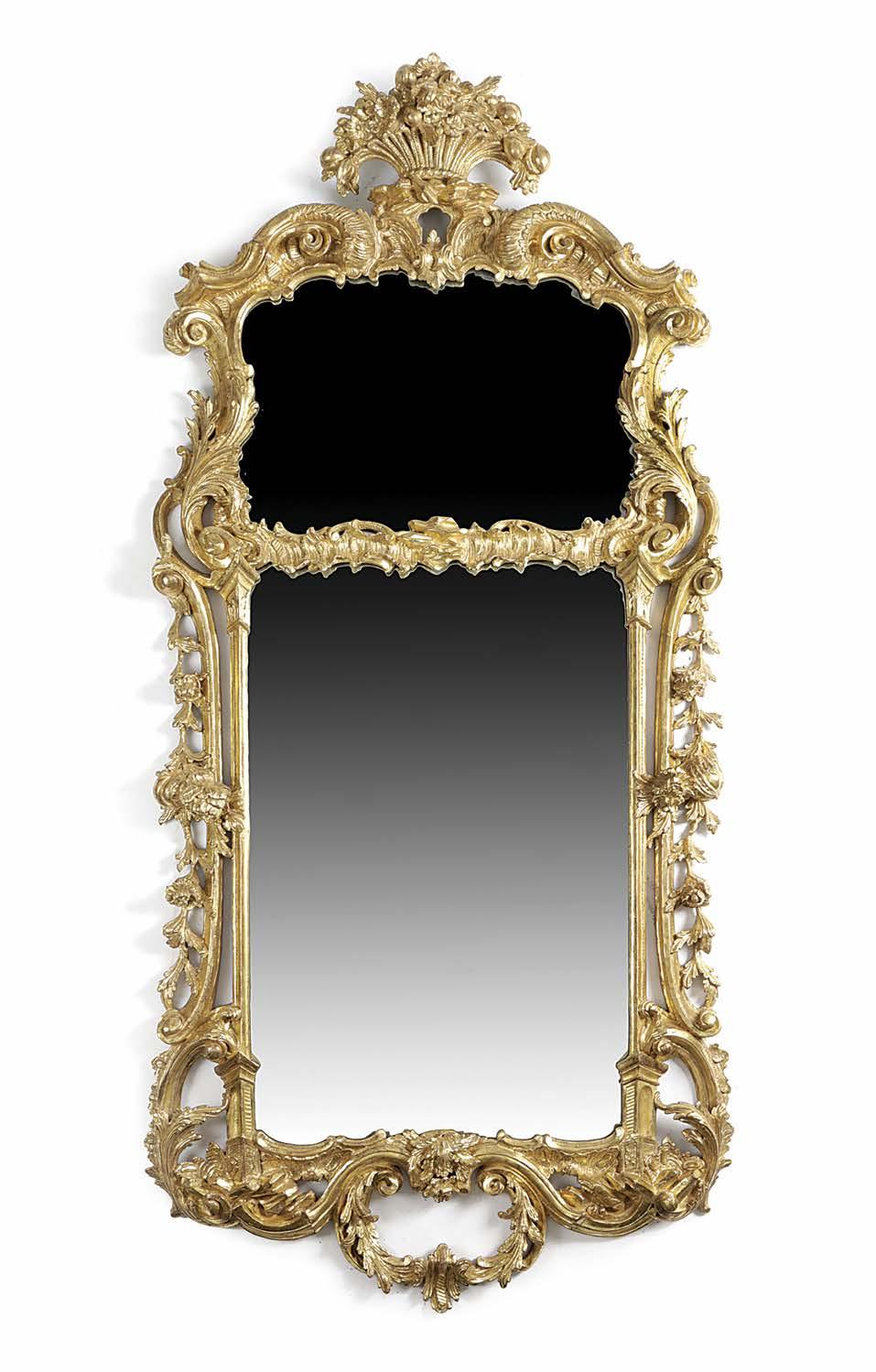 the two plates in a leaf, scroll and rocaille carved frame centred by a surmount of a basket of flowers, the two plates divided by a band of rockwork, regilded 188.4 x 89cm