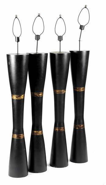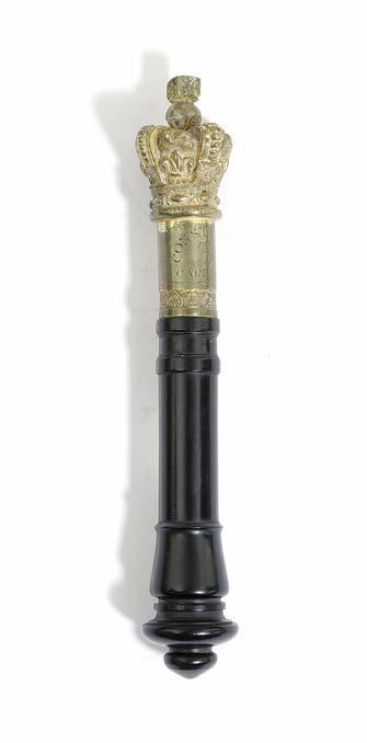 with an ebonised fluted stem above a stepped base decorated with laural leaves and stamped with registration number ‘308924’, the weighted base numbered ‘75 2’ 44cm high (excluding fitting)