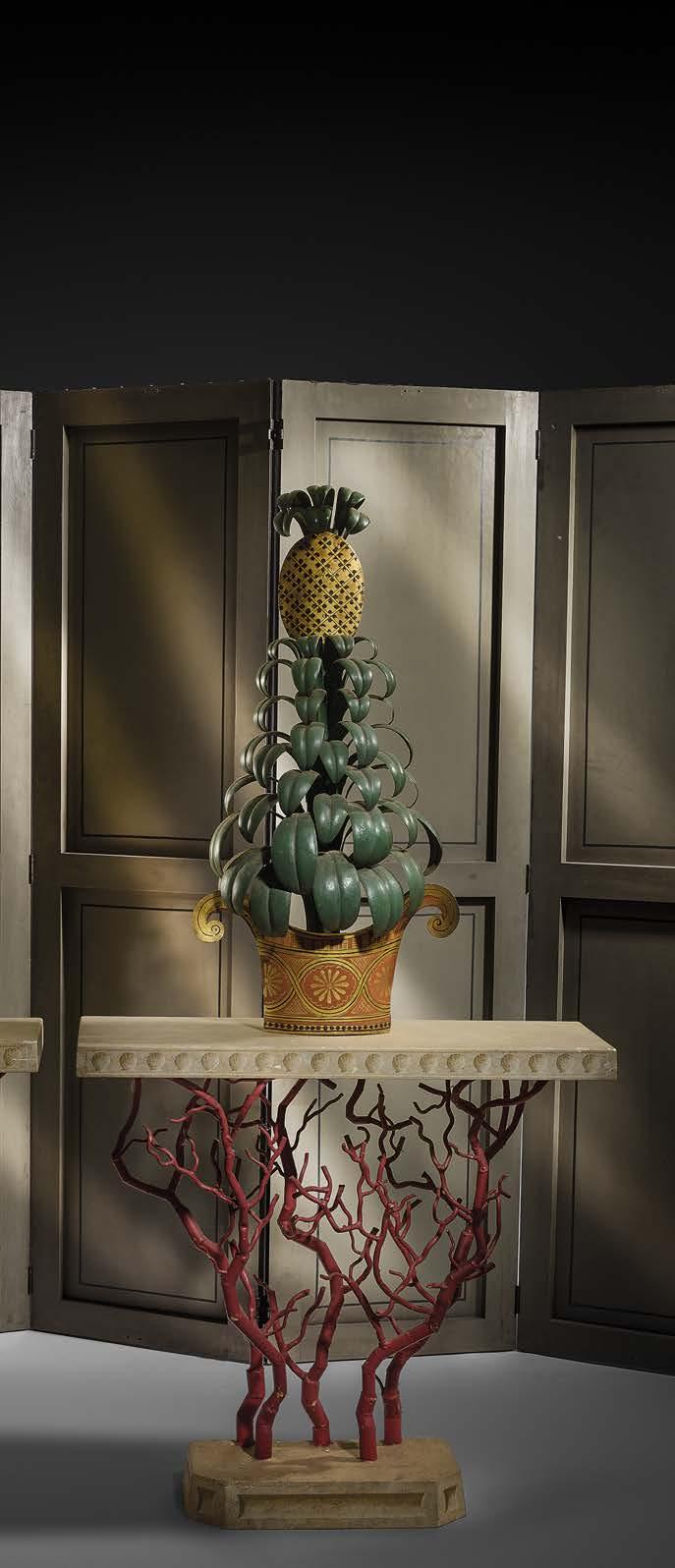 A pair of tôle peinte jardinière wall lights and painted wood and metal coral console tables SOLD FOR £6,300*
