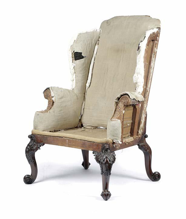 the flat topped back above scroll arms, the seat with a flat front rail, above front legs with foliate carved knees and scrolling feet, the back legs with scrolling wings and feet, in need of reupholstering