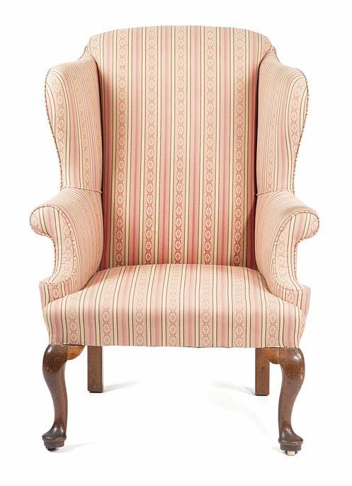 A MAHOGANY WING ARMCHAIR IN GEORGE II STYLE, LATE 19TH / EARLY 20TH CENTURY with a scroll back and arms, on cabriole legs with pad feet, later upholstered in gold silk damask fabric