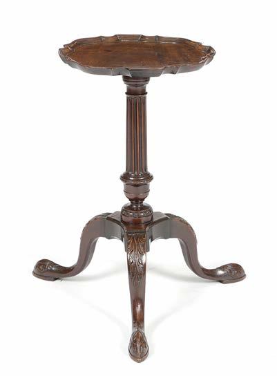 the fixed top with a moulded pie crust edge, above a fluted urn stem, on leaf carved legs 52cm high, 46cm wide