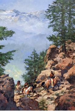 “High Tailin’ It” seemed like an appropriate title for this painting. To me it perfectly describes these three natives as they urge their horses to go up and over a ridge. Far below is a river that plummets onto the distant plains below. They may be in the process of escaping some hidden danger, or maybe they are on their way to quickly meet some fellow warriors. I always invite collectors to use their own imaginations to complete the story.