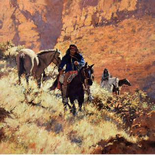 The warm colors and dramatic beauty of a canyon in the Southwestern USA sets the stage for “Two Ponies To Trade”. An Apache scout and his compadre, each with a spare mount in hand are about to head out to a place of trade. Whether they need fresh ponies, or other items of value we don’t know. We do know that ponies were of great value and horse trading was always an opportunity to bargain for a good deal .