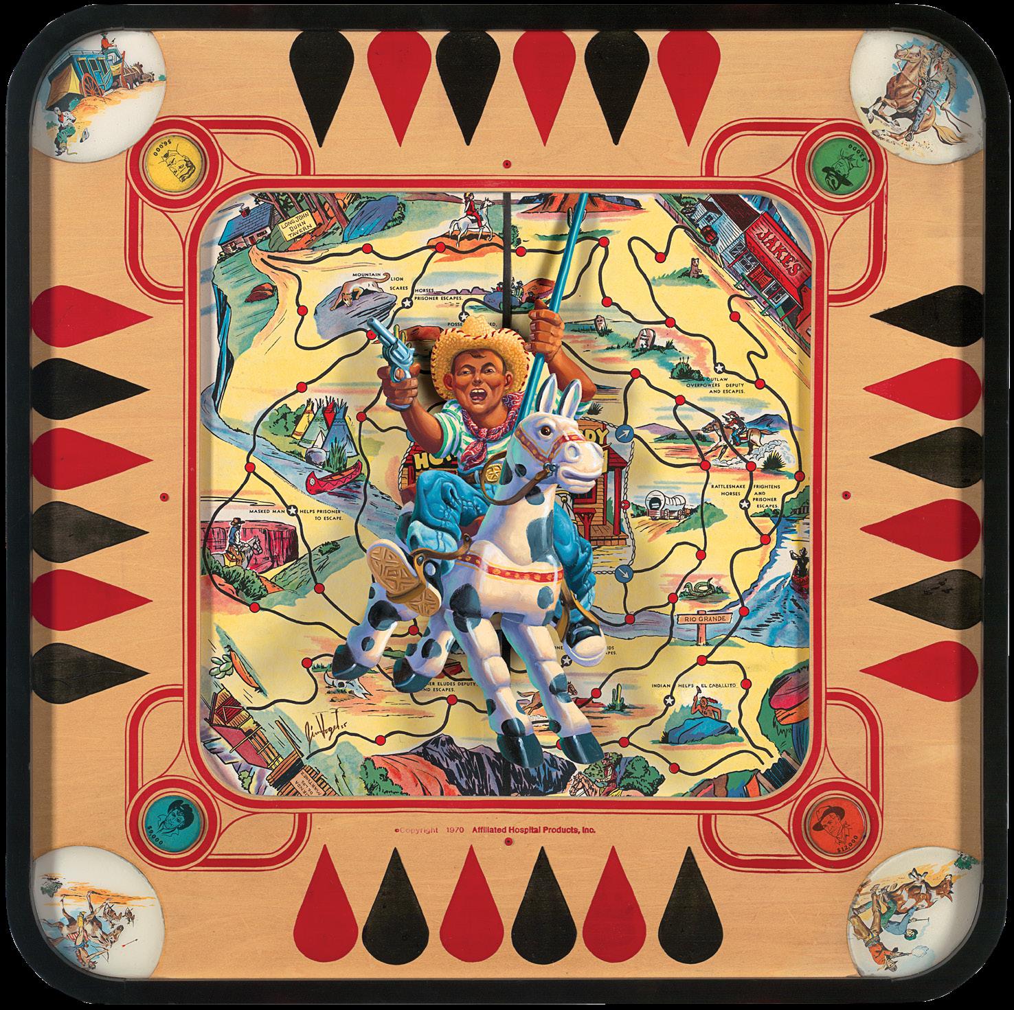 When I came across this old Western board game from the TV show Cheyenne, I was immediately drawn to the little Pony Express station pictured on it. It sparked a memory of those Pony Salesmen photographs that were so common in the mid20th century. From the 1930s into the 1960s, photographers would travel from town to town with a pony, dressing kids up as cowboys or cowgirls and capturing that moment of make-believe for just a small fee. The photos were often hand-colored, turning a quick street-corner portrait into a treasured keepsake. I’ve always carried one of those images—an old photo of my mother and her two little sisters in their cowgirl outfits, on the pony. It’s a piece of family history, and a reminder of how big those small childhood dreams could be. For this painting, I worked on a gesso panel and imagined our own Pony Express rider in silhouette, caught in a moment of hesitation—the kind of look you might see in a child who isn’t entirely sure about sitting on a horse but is willing to go along to please his parents. To complement the image, Christen framed the piece with her touch of history, and we added a small cast-iron bucking bronco toy at the bottom, tying the whole work back to the playthings and pastimes that inspired it. This piece is about memory and imagination, about the games we play and the stories they help us carry forward.
