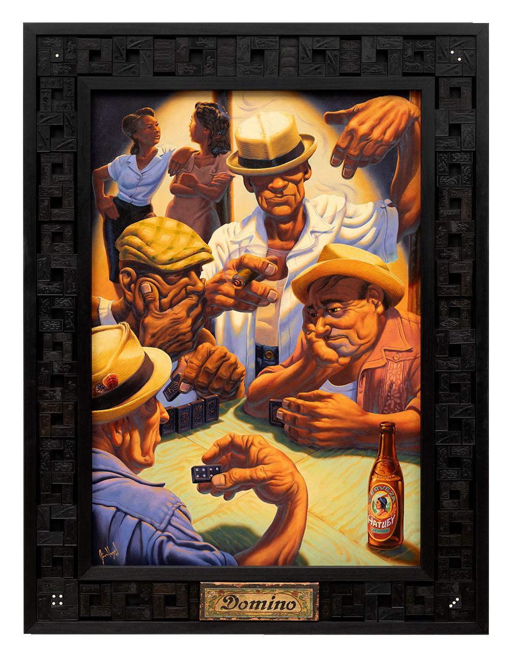 Inside the frame, I wanted to bring those dominos to life. I painted a group of friends gathered under the streetlights, cigar glowing in the dusk, cold bottle of Cerveza Hatuey ready to drink. You can almost hear the laughter and the clatter of tiles on the table. Off to the side, the neighborhood ladies lean in together, sharing the latest chisme. The gossip flows as naturally as the game—it’s all part of the rhythm of the night. This show is called It’s Not All Fun and Games, and for me, that title cuts both ways. Dominoes aren’t just a pastime; they’re a tradition, a community, a way of passing stories as much as passing time. Christen and I wanted the piece—the painting and the frame together—to feel like you’re stepping into that circle, where the game is only half the story and the people are the real heart of it.