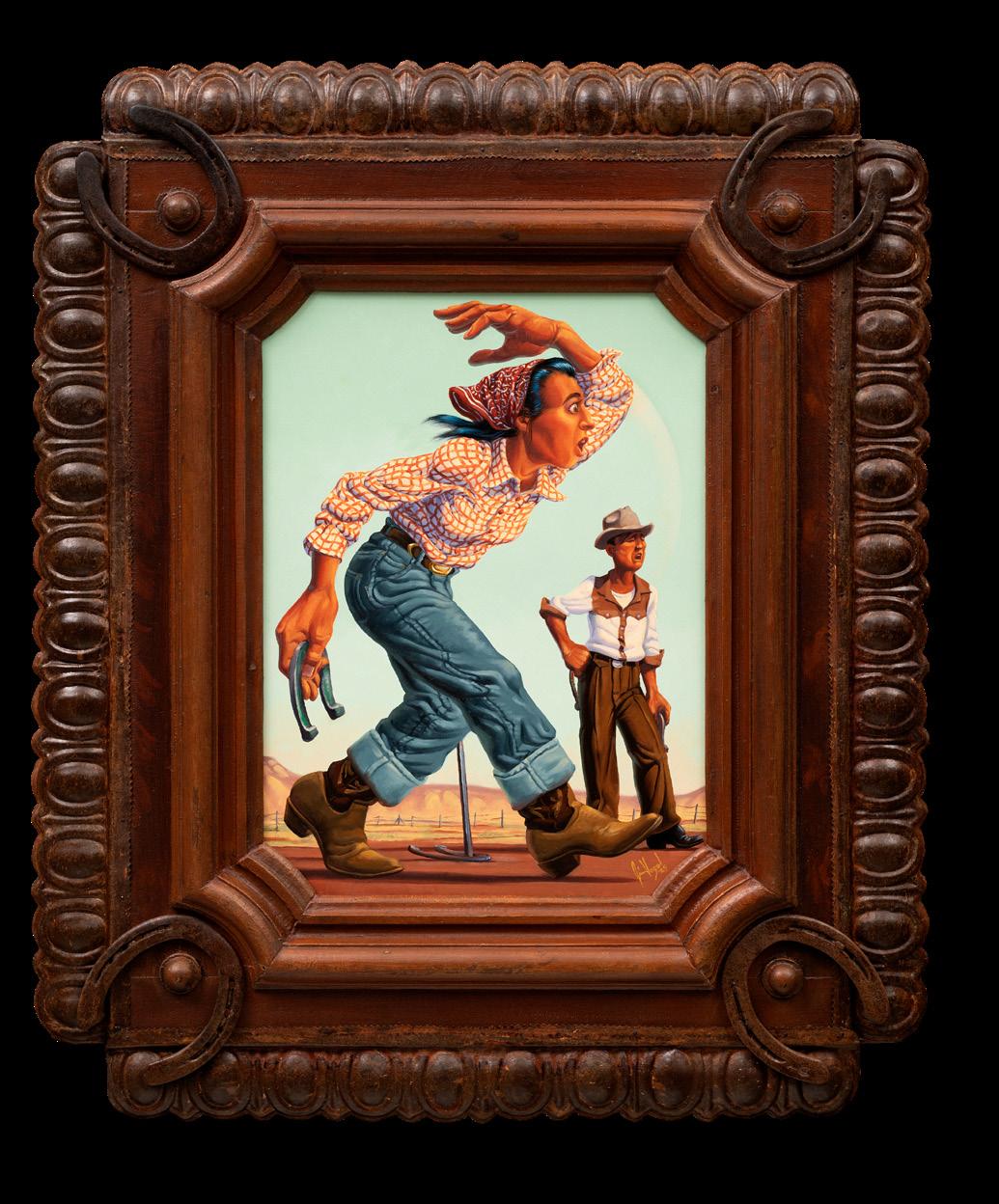 I wanted to capture the power of a child’s imagination—how easily a ride on a wooden horse becomes a life-or-death chase after outlaws. The game board beneath the scene represents Hollywood’s influence on the myth of the Wild West and how deeply that imagery has seeped into our shared culture. El Caballito is currently on display at the Couse-Sharp Historic Site’s exhibition Timeless Turns: The Legacy of Tio Vivo. Proceeds from the sale of this piece will support the mission of the Couse-Sharp Historic Site.