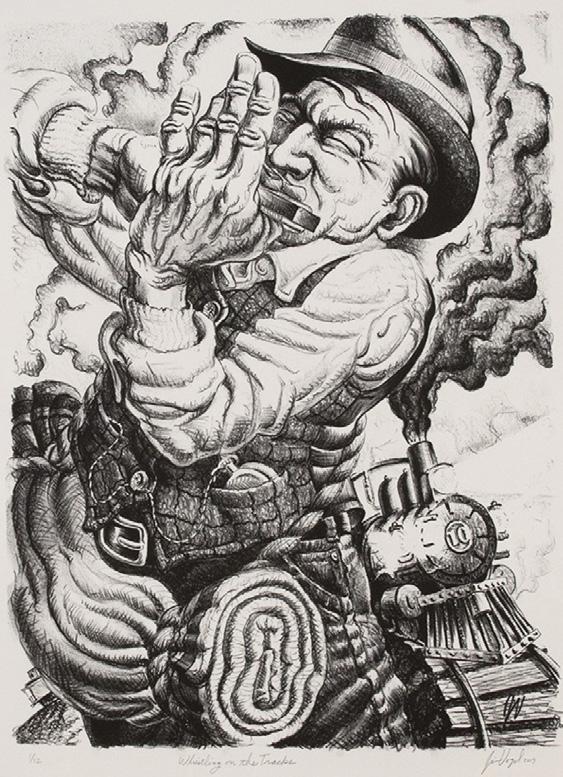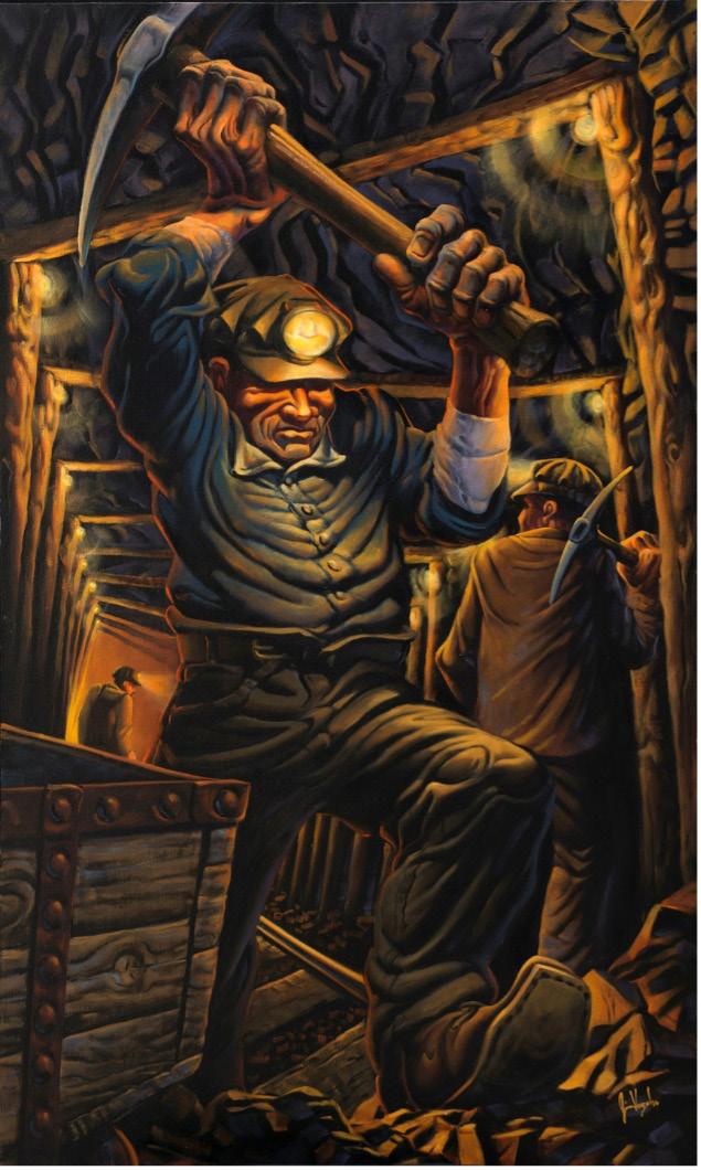 This painting, In His Father’s Shoes and two others in private collections, were created to commemorate the hard scrabble coal miners and their efforts to organize into a union in the early 1900s. The multi-ethnic miners worked in constant physical peril underground while also facing the mine owners’ oppressive labor practices in the company owned towns above. The title has the double meaning as the miner lands the final strike with his pick as a coworker walks out to join the strike on the surface.