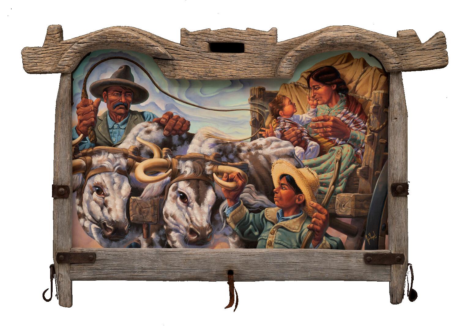Elfego Baca is a New Mexican Legend and my favorite mythic lawman of the West. This painting is based on Baca’s own story about his family’s move to Kansas from Socorro, New Mexico in 1865. He recounted being kidnapped by Navajos as an infant and returned a few days later because he was too loud and ornery. His father then decided New Mexico was too dangerous and moved his family to Topeka (really, Topeka, Kansas?) Elfego, his father and older brother returned to Socorro in 1880, after his mother and another sibling died in Kansas.