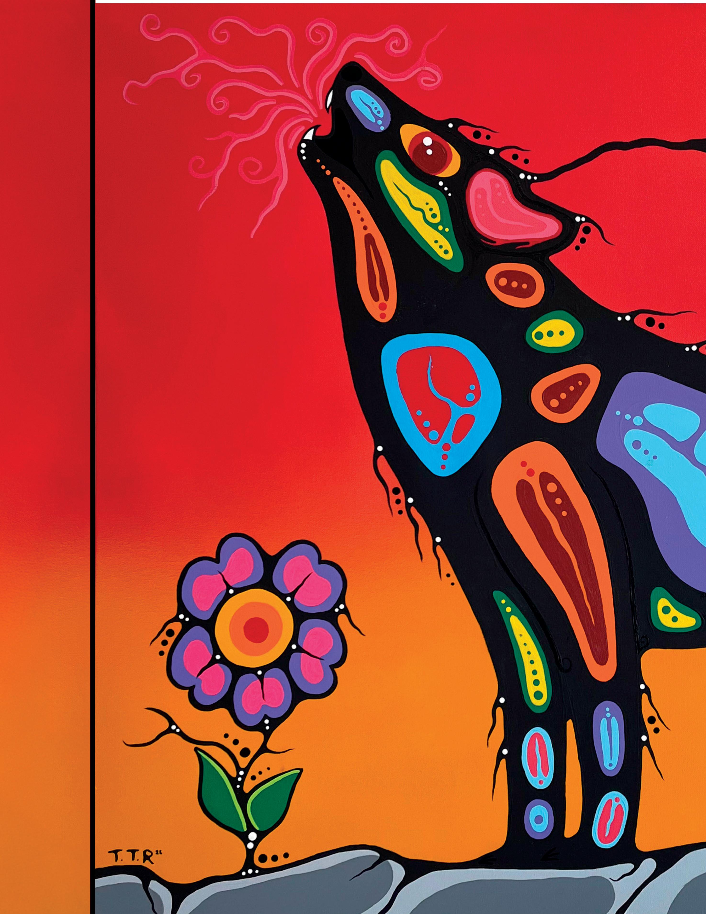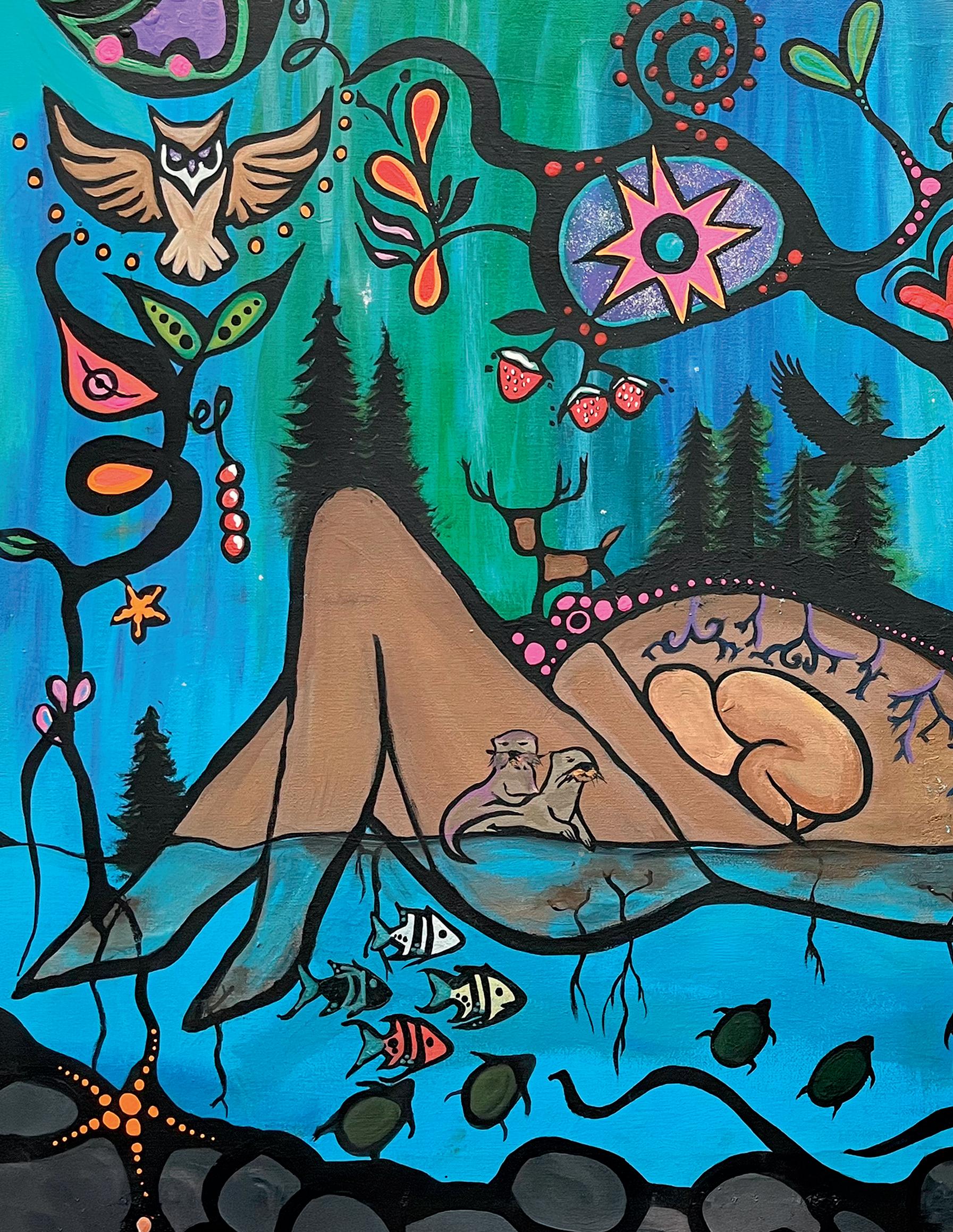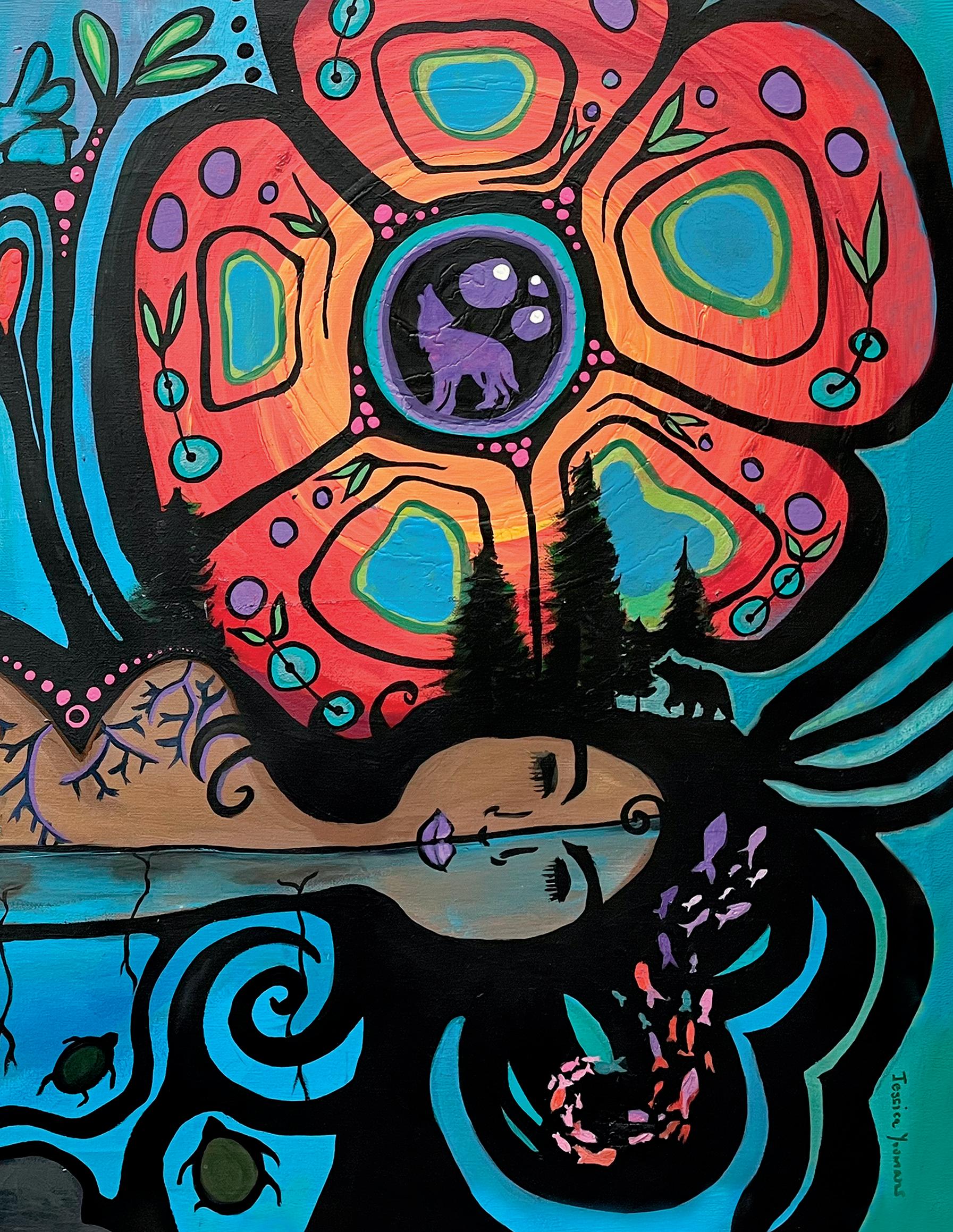 Jessica Youmans is an Ojibwe artist whose work explores cultural identity, healing, and womanhood. Through bold lines and symbolic imagery, she honours ancestry and resilience.