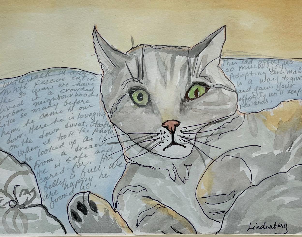 Lise Lindenberg is a retired visual arts educator and theatre collaborator whose work reflects her passion for community and animal welfare, often supporting local shelters through her art.