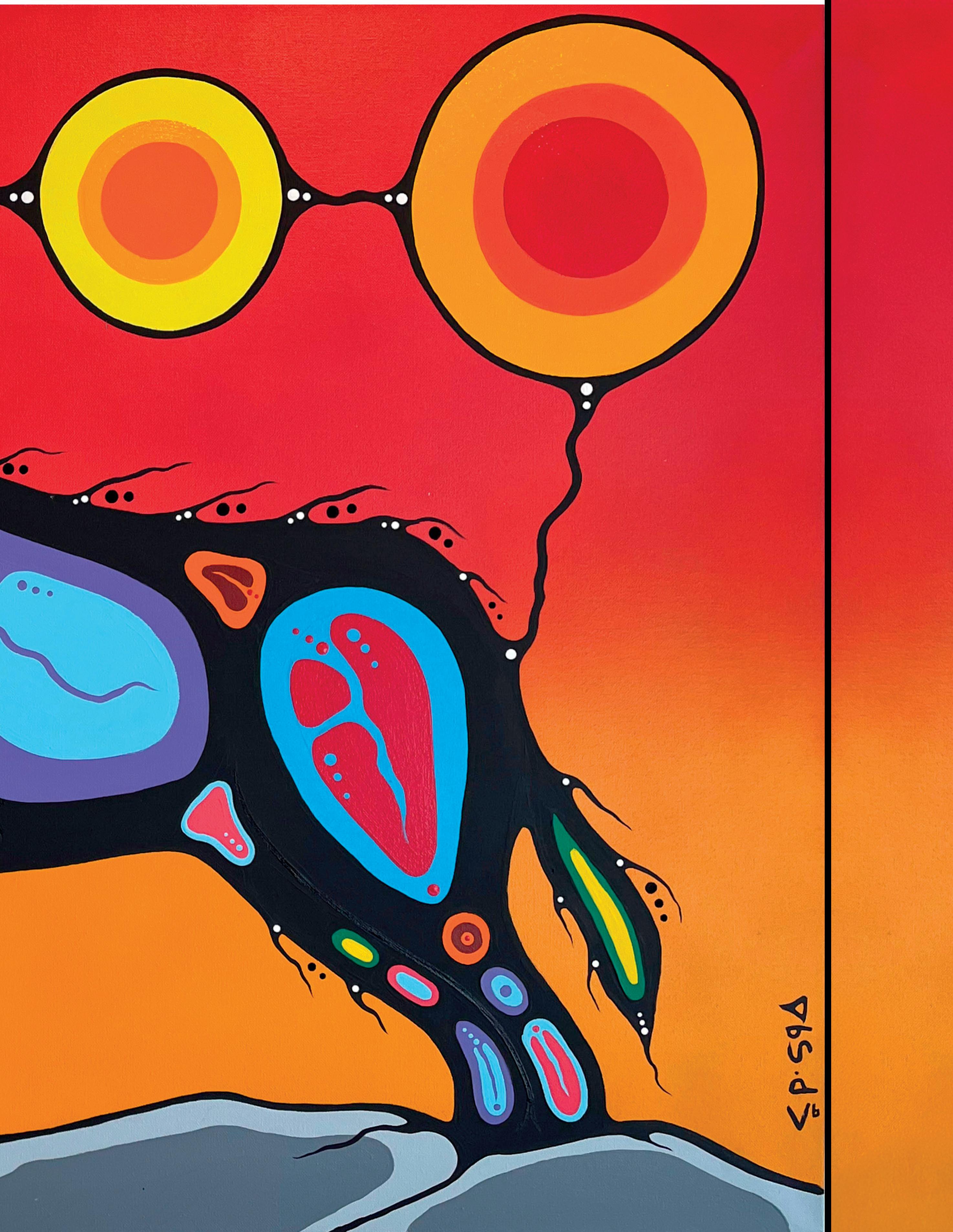 Angela Wiggins is a contemporary Anishinaabe artist whose work moves between abstraction and representation. Through bold colour and symbolic imagery, she explores identity, presence, and Indigenous knowledge systems.