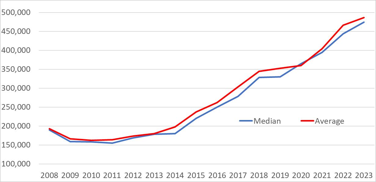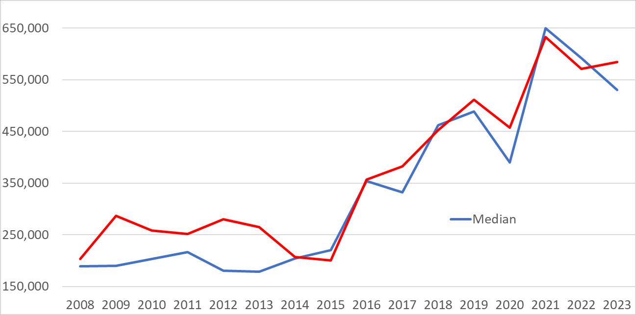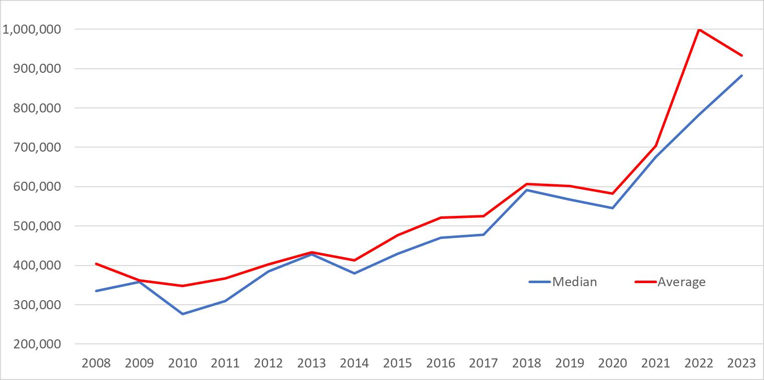 Active SOLD DOM U/C % Sales over $1 Million 2015 214 54 107 18% 8.8% 2016 256 61 103 25% 11.3% 2017 269 69 103 25% 12.5% 2018 261 95 87 28% 15.8% 2019 304 94 83 23% 16.3% 2020 258 145 101 19% 15.0% 2021 241 138 75 48% 24.3% 2022 216 215 57 62% 30.2% 2023 338 166 78 25% 31.4%