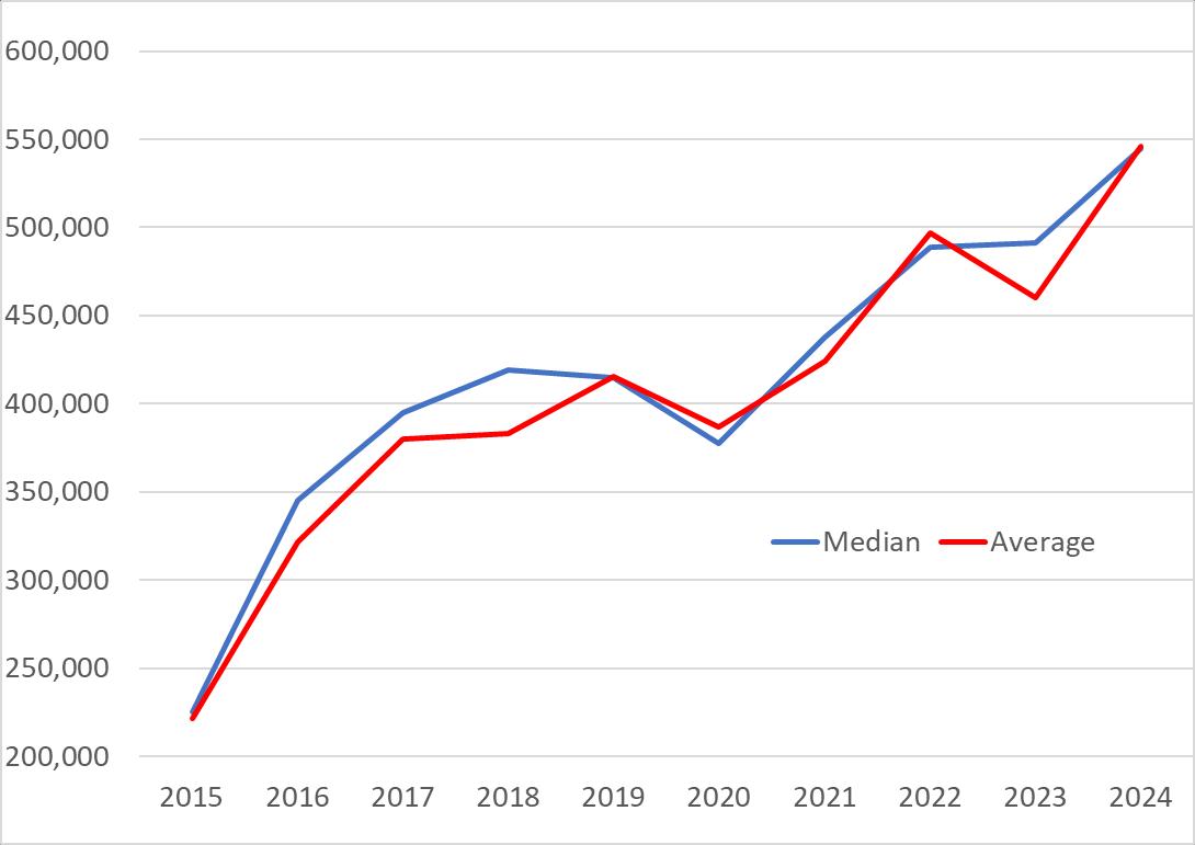 2020 2021 2022 2023 2024 Boulder $1,000,000 $1,362,500 $1,458,355 $1,392,500 $1,425,000 Louisville 669,500 821,250 1,000,000 910,000 957,500 Lafayette 546,000 675,750 782,500 882,500 917,500 Longmont 455,000 497,500 603,000 608,000 577,000 Sub. Plains 666,000 925,000 940,500 1,033,500 980,000 Sub. Mtns 650,000 870,000 1,136,000 1,005,000 769,000 Superior 632,000 838,000 897,500 920,500 920,000 Bldr County 609,000 760,000 872,750 900,000 910,000 Broomfield 570,000 635,000 690,050 705,500 640,500 Erie 520,000 740,000 762,500 725,450 735,000