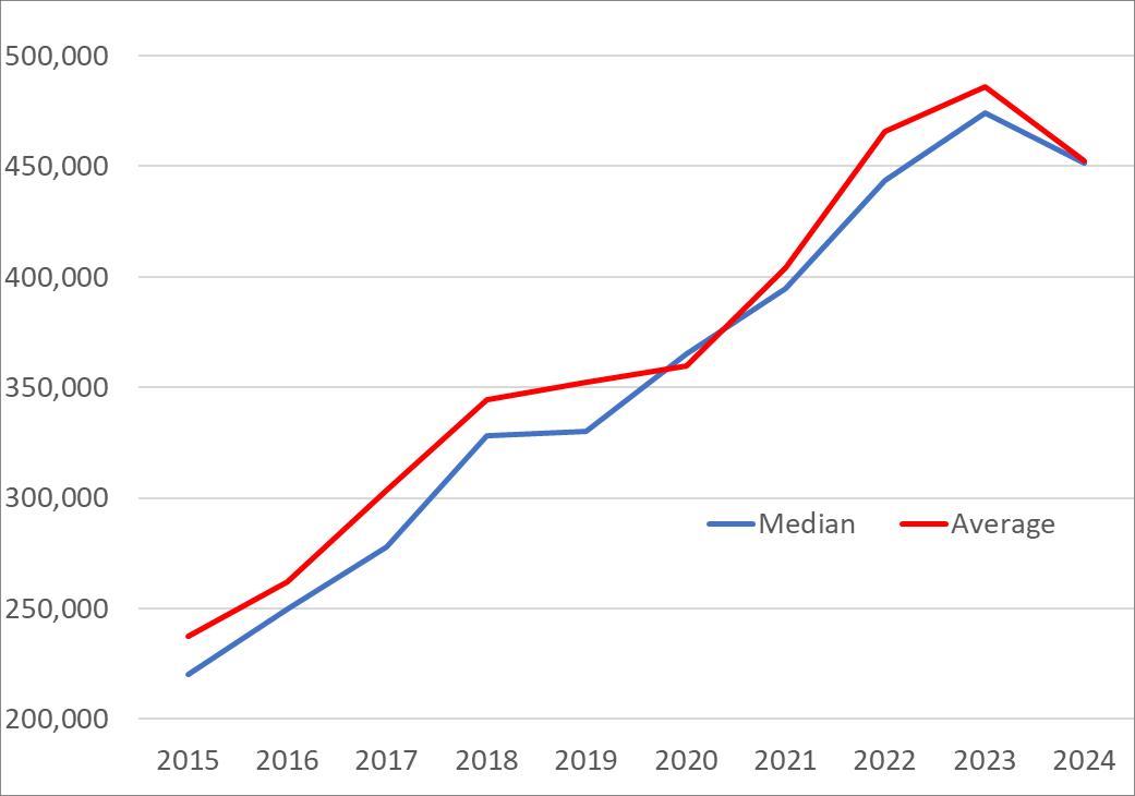 Year 2024 % Change Year 2023 2 yr. Change Year 2022 Total Active Listings 32 68.4% 19 166.7% 12 Median Sales Price $957,500 5.2% $910,000 -4.3% $1,000,000 Average Sales Price $1,077,766 2.5% $1,051,012 -1.8% $1,097,331 SP/LP Ratio 98.1% 0.9% 97.2% -9.3% 108.1% Average Market Time 58 -14.7% 68 132.0% 25 Number of Sales YTD 24 26.3% 19 -14.3% 28 Expired Listings 9 125.0% 4 350.0% 2 Months of Inventory 4 33.3% 3 207.7% 1.3 % Under Contract 38% -34.5% 58% -54.2% 83% 30 Year Mortgage 6.79% 7.4% 6.32% 62.8% 4.17% From IRES MLS 4/3/2024