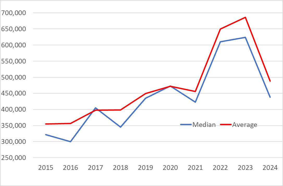 Year 2024 % Change Year 2023 2 yr. Change Year 2022 Total Active Listings 48 41.2% 34 77.8% 27 Median Sales Price $769,000 -23.5% $1,005,000 -32.3% $1,136,000 Average Sales Price $1,066,494 -19.0% $1,316,109 -22.9% $1,383,881 SP/LP Ratio 97.2% 1.0% 96.3% -3.1% 100.3% Average Market Time 84 -46.5% 157 44.8% 58 Number of Sales YTD 33 0.0% 33 6.5% 31 Expired Listings 25 108.3% 12 38.9% 18 Months of Inventory 4.4 41.9% 3.1 69.2% 2.6 % Under Contract 23% -20.7% 29% -52.1% 48% 30 Year Mortgage 6.79% 7.4% 6.32% 62.8% 4.17% From IRES MLS 4/3/2024