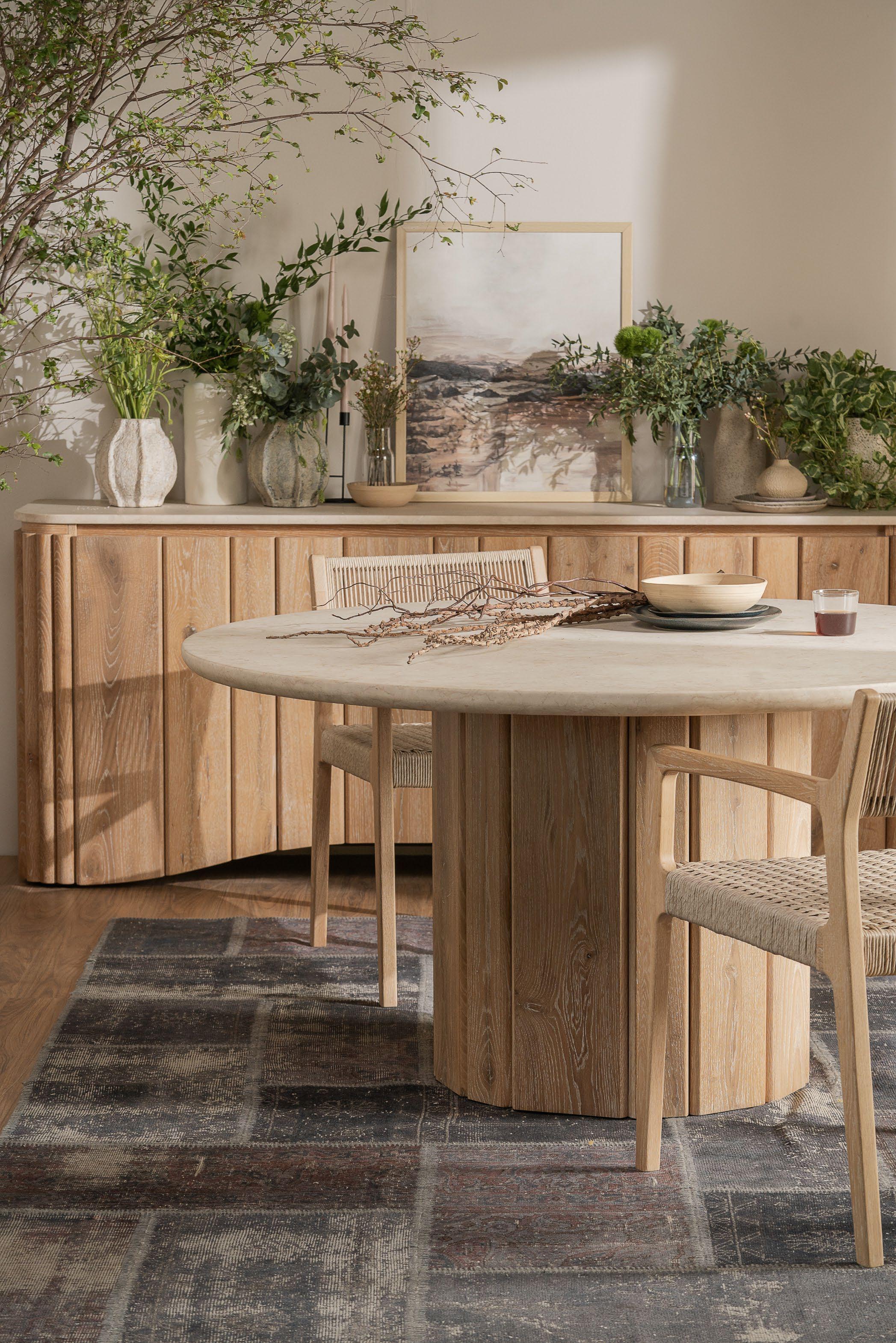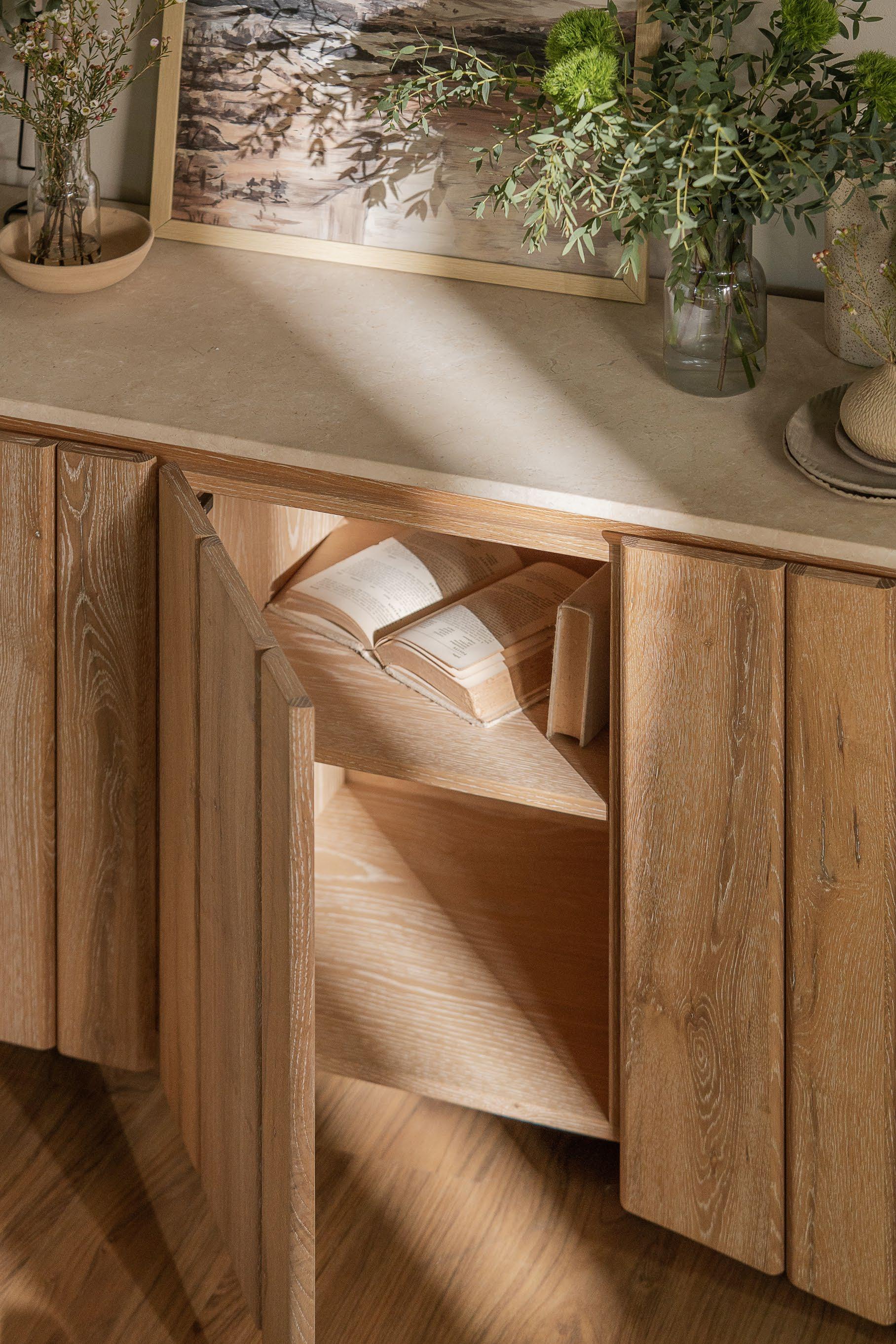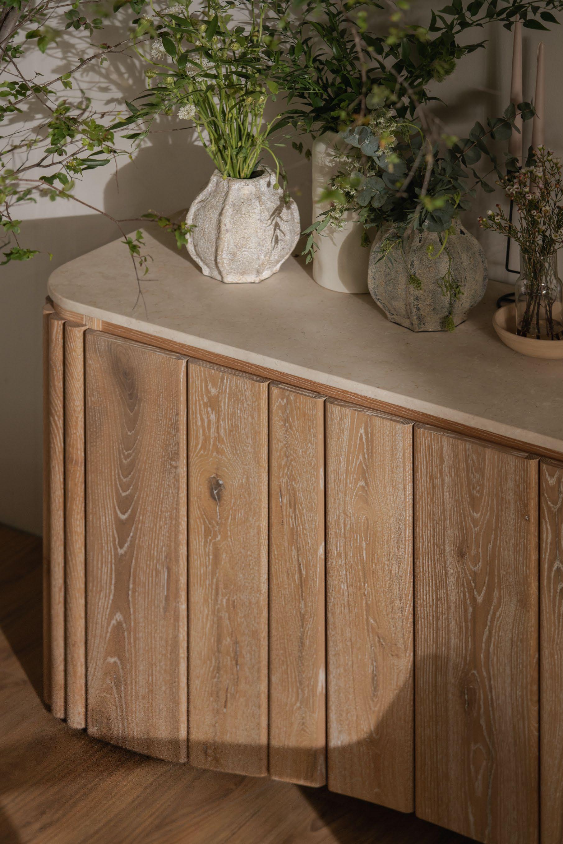 Graceful curves meet the vertical rhythm of finely crafted oak, giving the Calibre Sideboard a sculptural presence. Topped with smooth, matte-finished cream marble, the sideboard becomes an embodiment of quiet sophistication that elevates any modern interior.