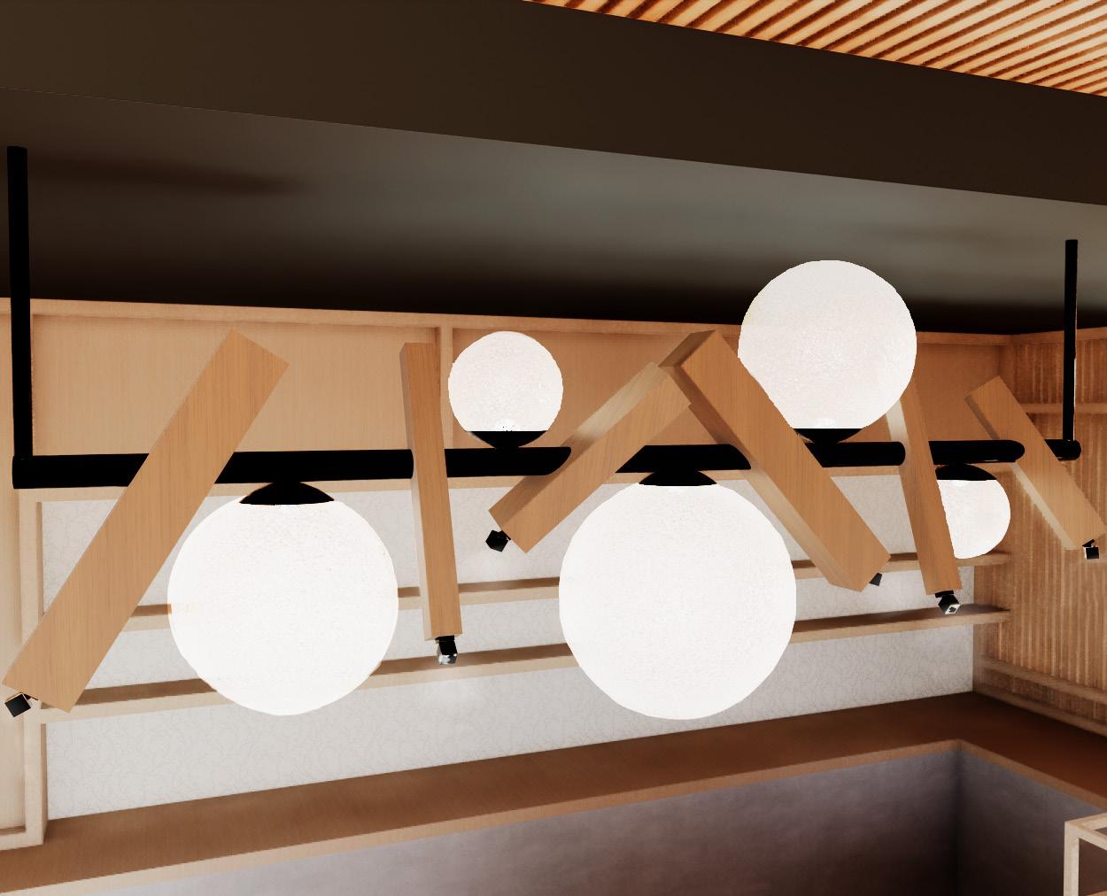 This distinctive and functional light fixture serves as a centerpiece for the Binary Numbers Internet Cafe, supporting its growing network and embodying its digital theme. In this design, the 0s are represented as acrylic spheres that provide an ambient light, delivering ample illumination for the service counter. Meanwhile, the 1s are made from as recycled solid wood and feature detachable track lights, to enhance the presentation of baked goods and spotlight different parts of the service counter.