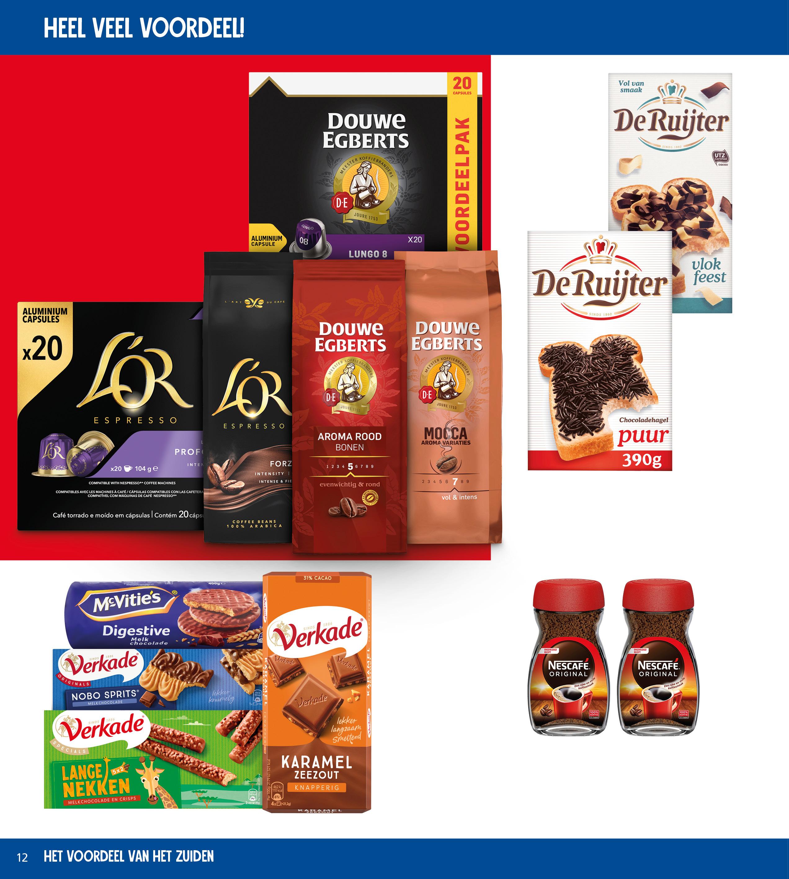 2 voor 3,00 Verkade koeken of chocoladerepen of McVitie’s alle varianten 2x pak of reep 100-400 gram 3,18 - 4,18 2 voor 4,00 De Ruijter alle varianten chocoladevlokken of -hagelslag 2x pak 140-390 gram 5,78 - 7,10 4,99 Prijs per kilo 24,95 Nescafé oploskoffie original pot 200 gram 6,39 =tot 43% KORTING Douwe Egberts of L'OR bonen of capsules alle varianten 2x pak 10 of 20 stuks of zak 500 gram 5,50 - 19,58 4,13 -14,69
