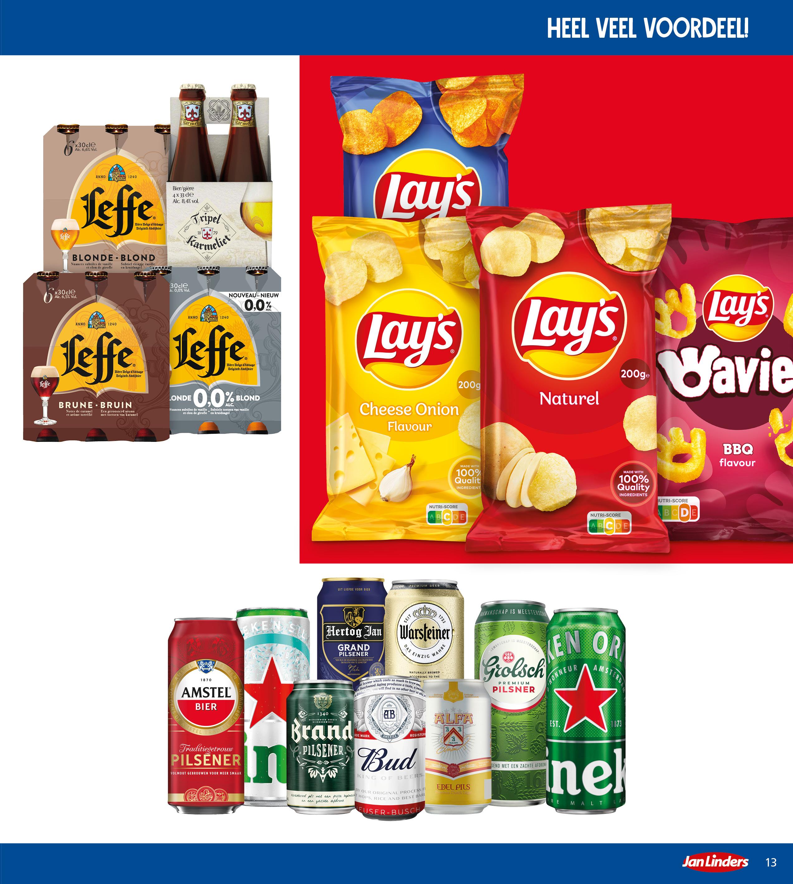 Lay's flat of Wavies 2x zak 115-200 gram m.u.v. Lay’s flat 120 gram 3,58 - 3,98 2 voor 3,00 korting 25% Leffe of Karmeliet alle varianten tray 4/6x 30/33 cl of krat 24x 25 cl 6,09 - 21,29 4,57-15,97 Beste bier su p ermarkt 11x korting 25% Alfa, Heineken, Amstel, Brand, Bud, Grolsch, Hertog Jan of Warsteiner pilsener in blik alle varianten blik 30-50 cl 0,90 - 1,39 0,68 -1,04 2 e HALVE PRIJS: 25% korting op de totaalprijs van 2 producten.