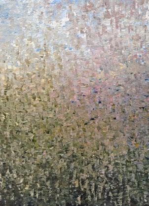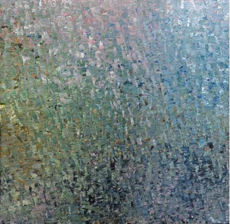 His series “There is Another Sky” features highly textured paintings that capture moments or fragments of memory in a pixilated, pointillist style. These works are unified by their depiction of light using textured acrylic paint with varying degrees of translucency and reflectivity.