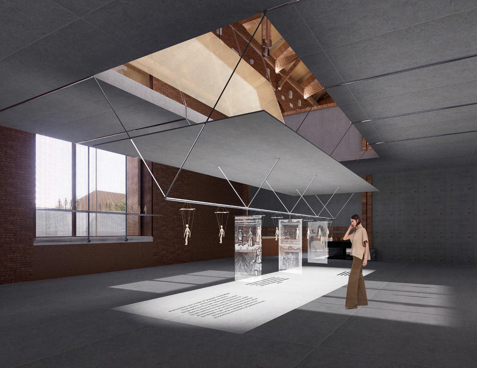The entire building, including the walls, floors, puppet display platforms, and even the puppets themselves, is suspended and controlled by the roof trusses and cable structures, mirroring how puppets are manipulated with strings and rods.