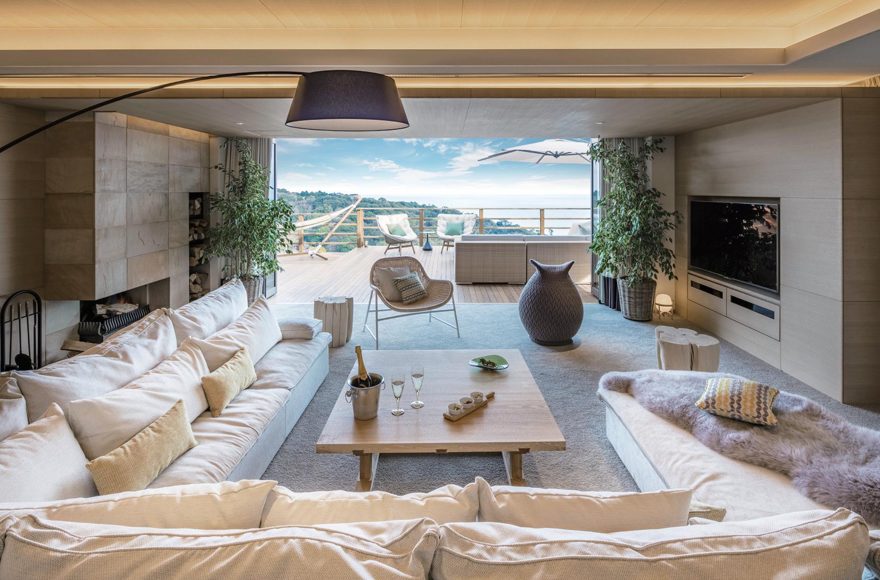 リビングダイニングの大きく開かれた窓からは太平洋、初島、水平線、大 空と森を望む絶景が広がり、四季折々の自然が楽しめます。