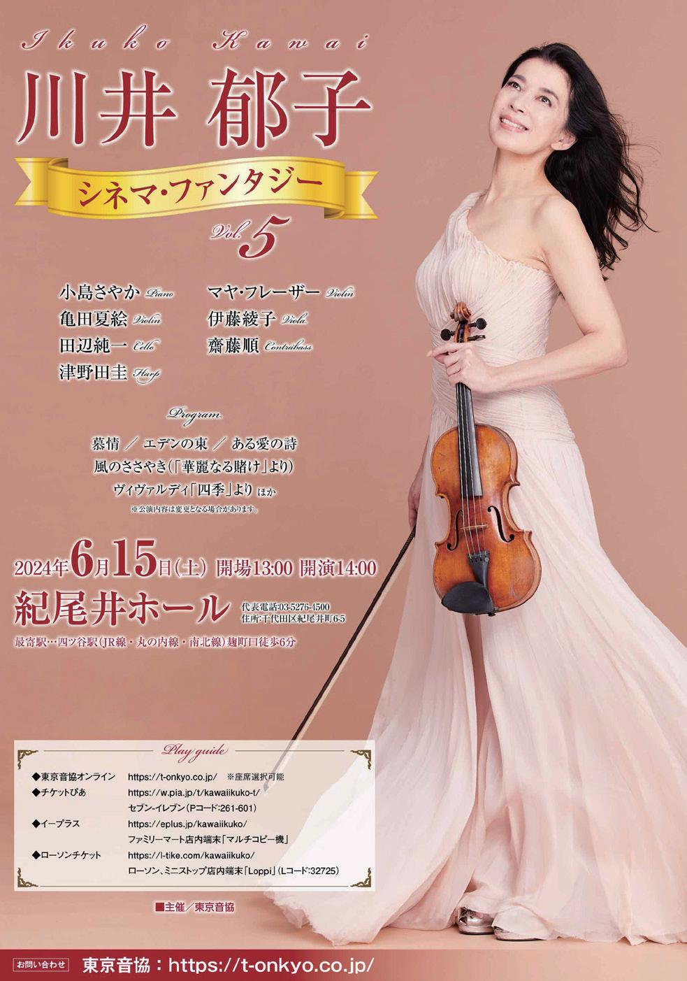 2024年6月15日(土)に紀尾井ホール(東京都千代田区)で開催される川井 郁子さんのコンサート「シネマファンタジー」は、皆さんがよくご存知の名画 や、人気の高い映画の音楽をお届けする公演で、川井郁子さんのヴァイオリン と、弦楽合奏、ピアノ、ハープという編成で演奏いたします。