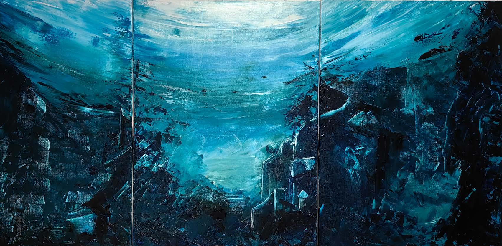 I have often been using brushes in my paintings. However, I increasingly work with a palette knife—mixing colors directly on canvas to create underwater worlds, moving the knife in imitation of wave motion. It becomes an immersive game, where knowing when to stop is crucial, so as not to “disturb the waters” too much.