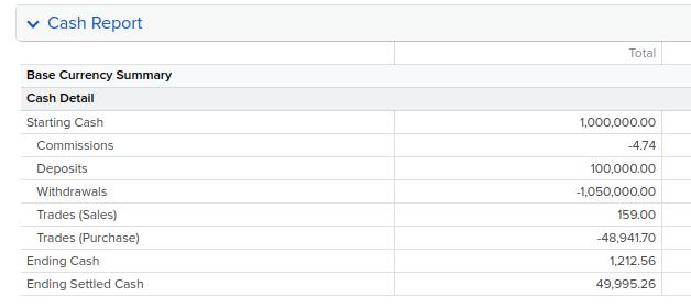 The long call position debited $48,941.70 and short call position credited $159 leaving behind $1,212.56 remaining cash as detailed in the cash report: