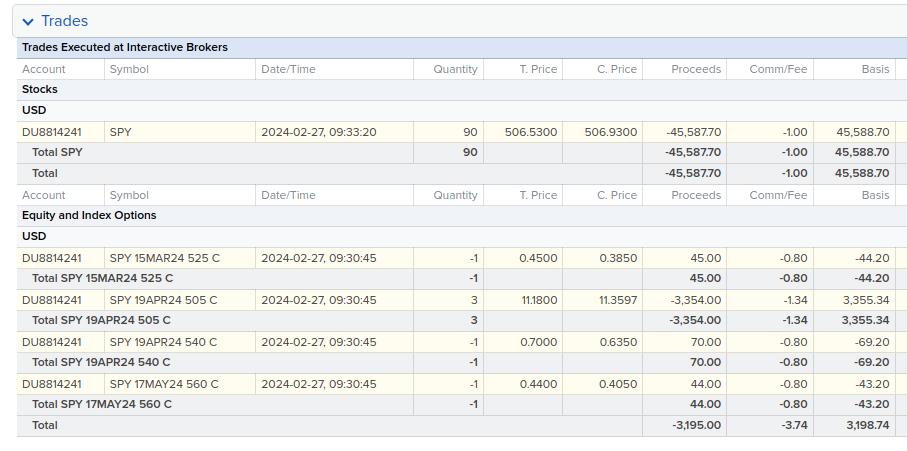 Next, we examine the trade statement on the 15th March to check "SPY 19APR24 505 C" closing price: