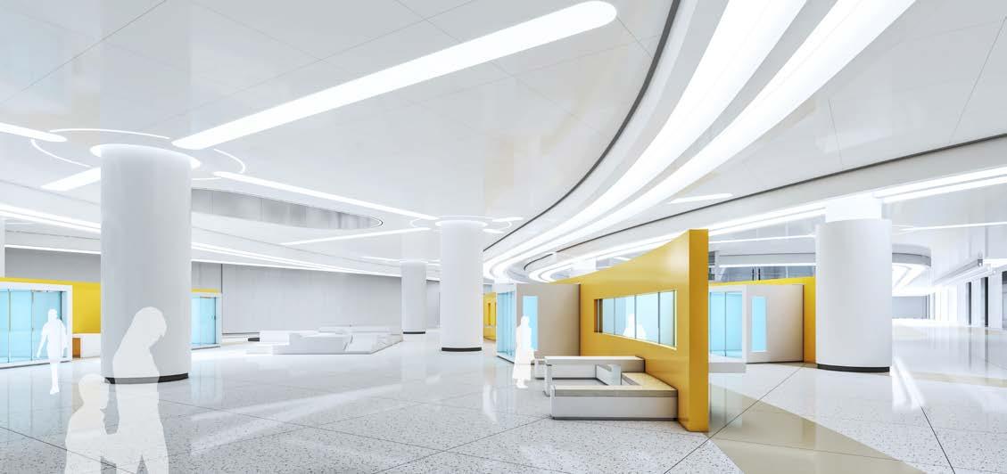 A strong, artistic decorative wall panel is used as a planar symbol in all levels and spaces as a common design thread element. The panel is usually associated with vertical circulation such as Escalators and Stairs but can be used in other spaces as well.
