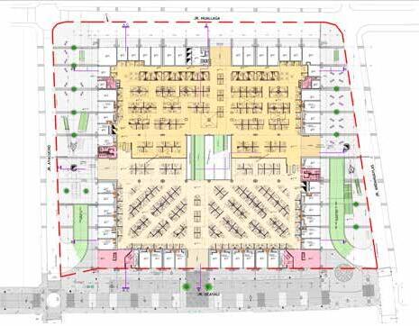Dicho complejo debía integrar un múltiple programa de usos y ser capaz de construirse por etapas, es de ese modo que se propuso organizar espacialmente los diferentes volúmenes mediante una plazuela central.
