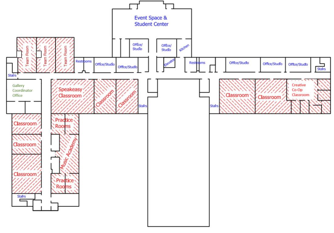 Some of the space will also be repurposed and designed as a recording studio for our growing music technology program and backstage artist suite, complete with dressing rooms, a greenroom, and space for company management.