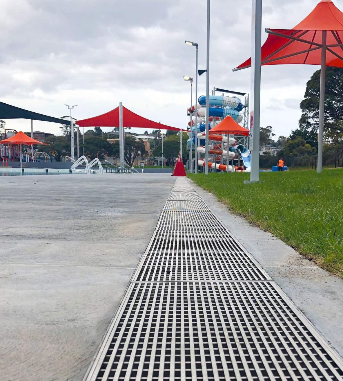 Hinged grate and frame manufactured with a precast concrete surround designed for fast installation on site. Applications include subdivision inter allotment drainage, landscape area’s as well as asphalt car parks. It’s ready for quick installation, tested for wheel loading, has a minimum 40mpa concrete, and a steel reinforcement to AS4671.