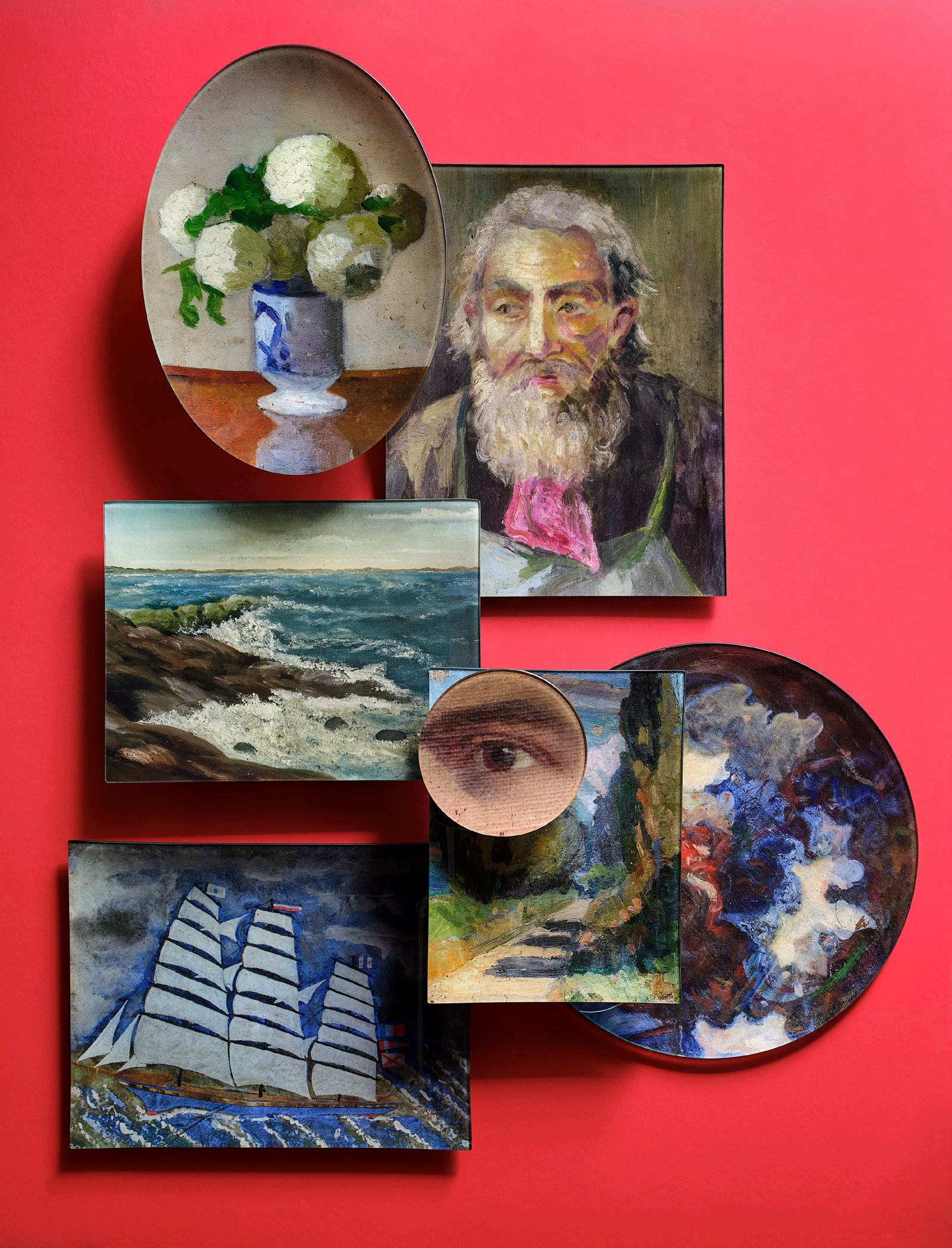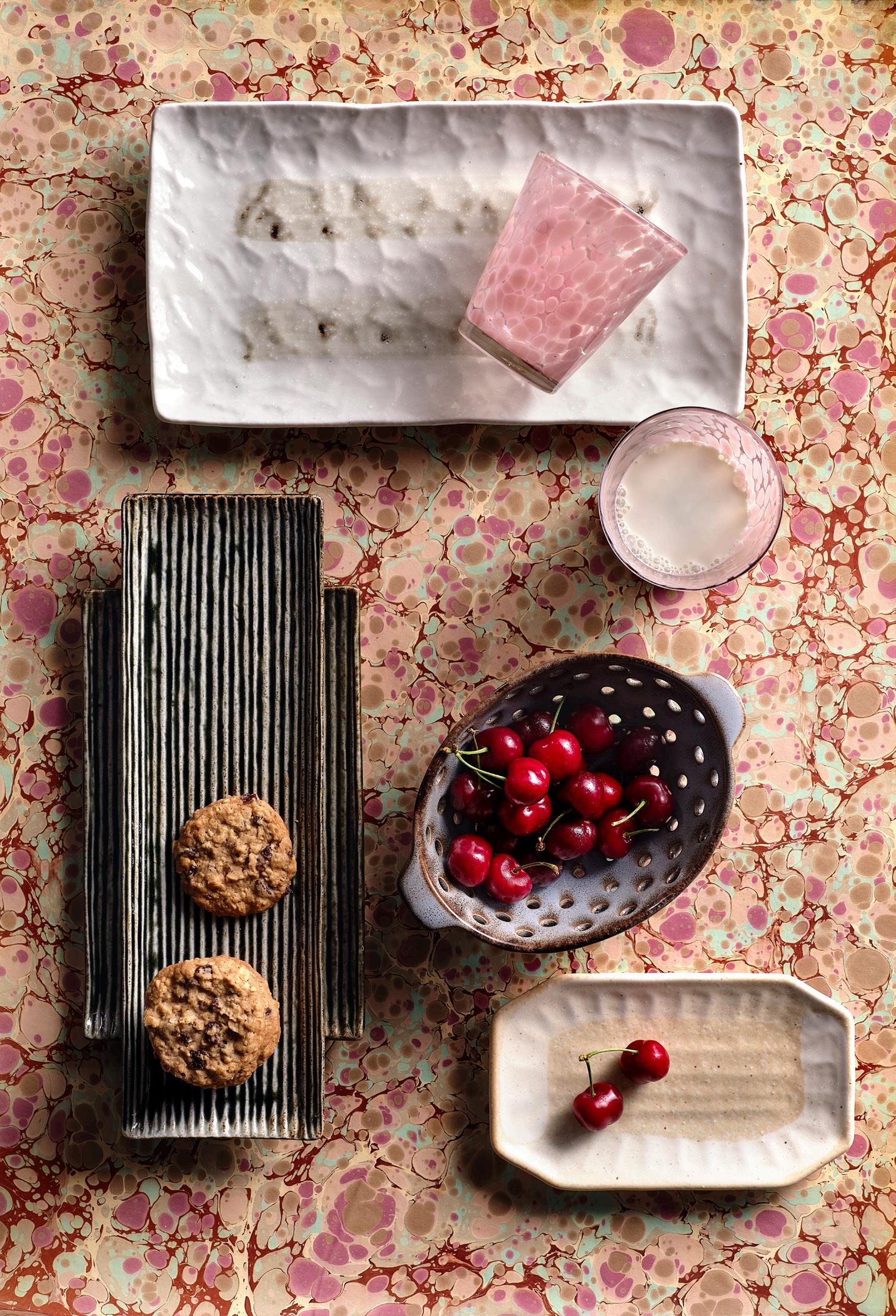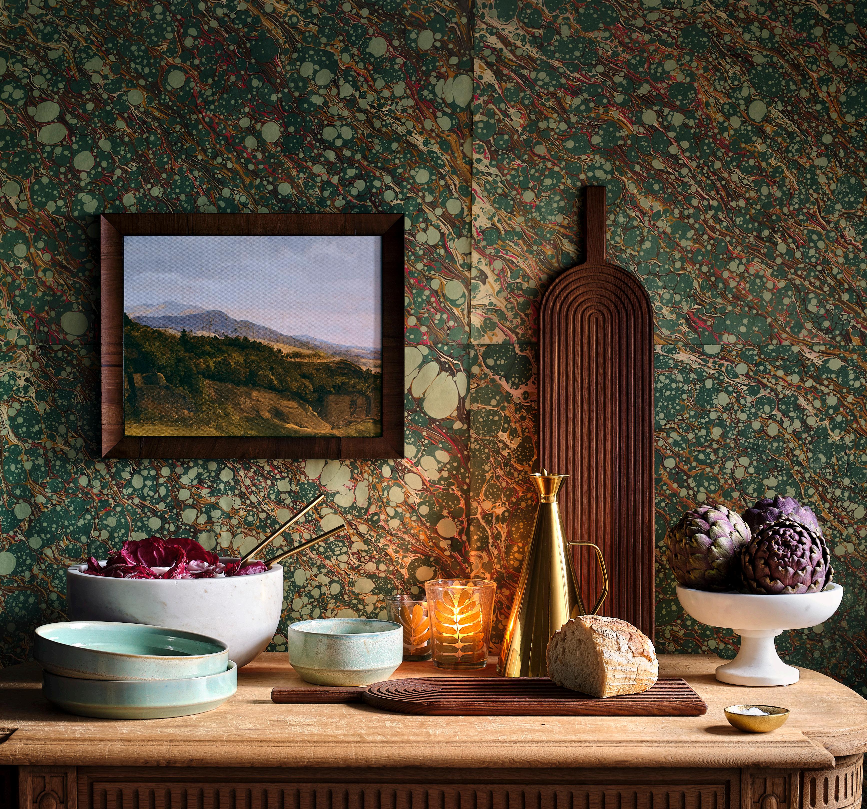 THIS PAGE: TURQUOISE DISHES $30 - $48 glazed porcelain • SANJA BOWL $175 marble • PASTORAL LANDSCAPE $150 giclée on canvas • SKYLAR SERVEBOARDS $150 - $165 thermo-treated ash