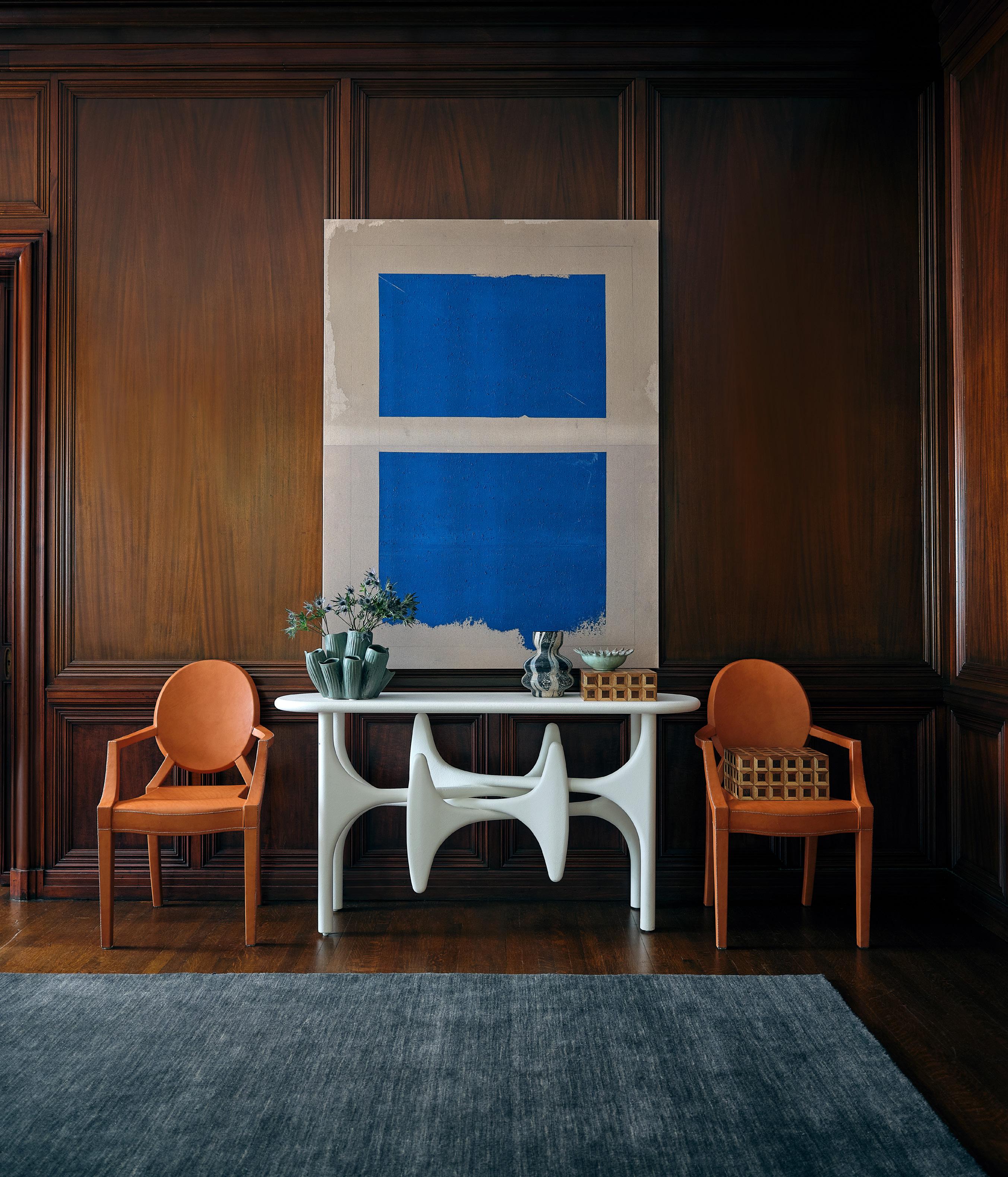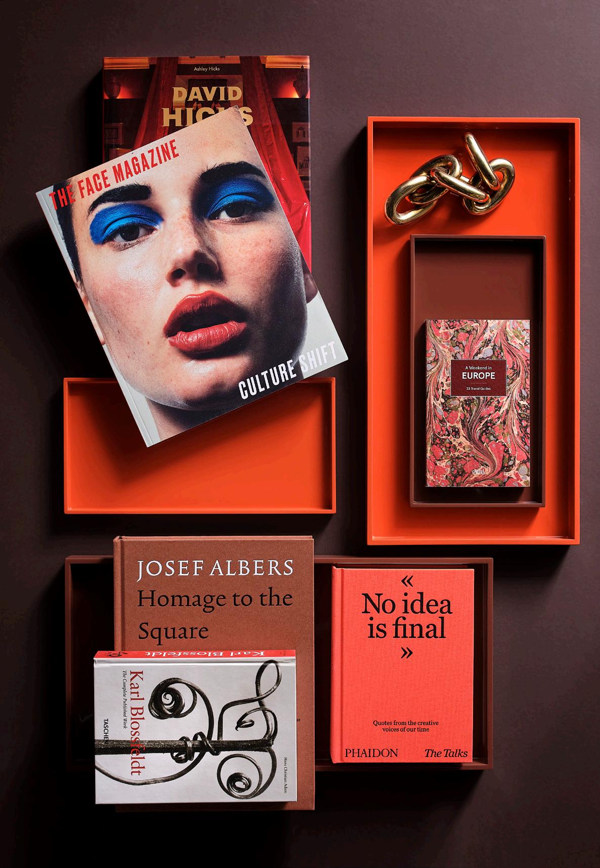 LEFT: THE FACE MAGAZINE: CULTURE SHIFT $40 • DAVID HICKS: A LIFE OF DESIGN $65 • BRASS CHAIN $195 • A WEEKEND IN EUROPE: 23 TRAVEL GUIDES $48 • JOSEF ALBERS: HOMAGE TO THE SQUARE $80 • KARL BLOSSFELDT: THE COMPLETE PUBLISHED WORK $30 • THE TALKS: NO IDEA IS FINAL $35 • PELHAM TRAYS $95 - $195 lacquered finish RIGHT: ALPHABET MATCHBOX COVER $65 brass • JH LUME TAPER CANDLES $1795 EA set of two, handmade from a proprietary wax blend OPPOSITE PAGE: LOUIS CHAIRS $1,295 EA natural leather, cross-stitched details • IRVING CONSOLE $2,695 plaster, alder wood • SHOAL VASE $375 glazed ceramic • ESTELLE VASE $195 painted glass • EQUINOX BOWL $58 glazed stoneware • PIETRO BOXES $195 - $250 mango and acacia wood • EQUILIBRIUM ARTWORK $2,595 giclée • OLGA CARBON RUG starting at $195 hand loomed wool, available in seven sizes