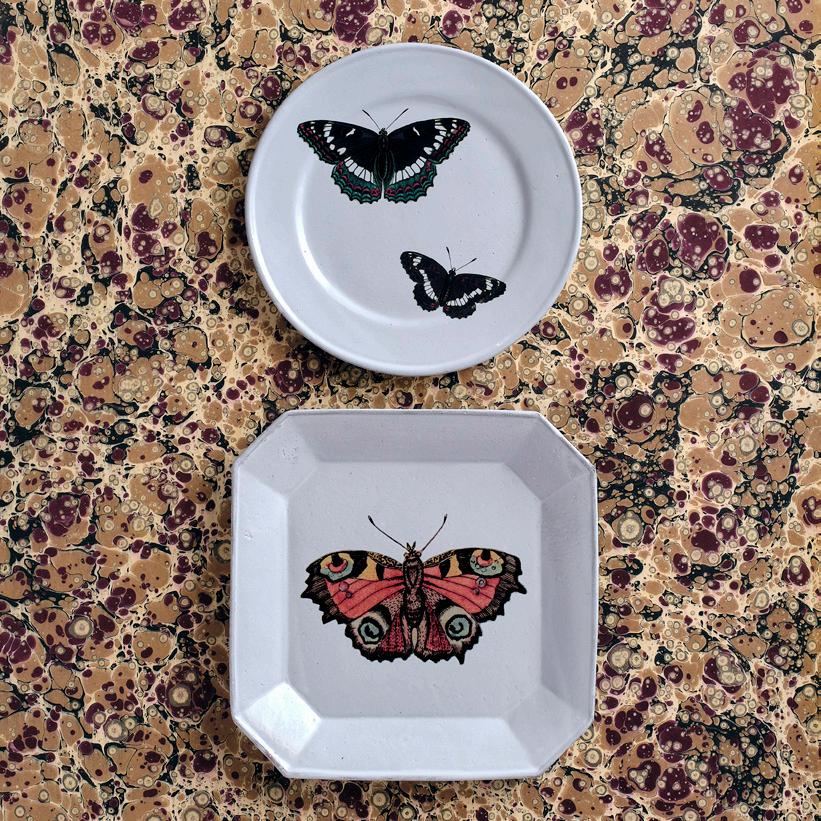DERIAN BUTTERFLY PLATES two butterflies $114 red butterfly $98 glazed terracotta 2 MOORE