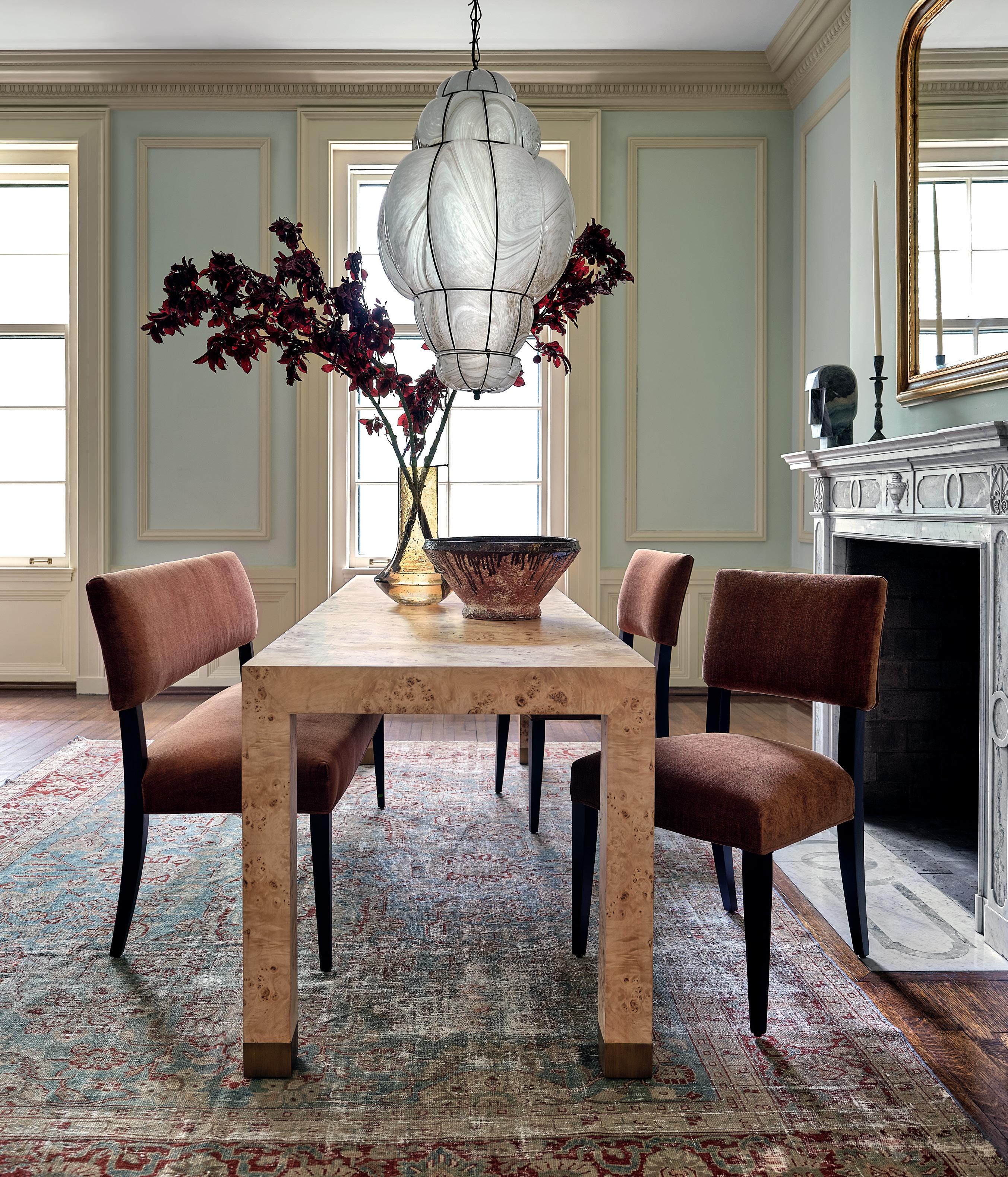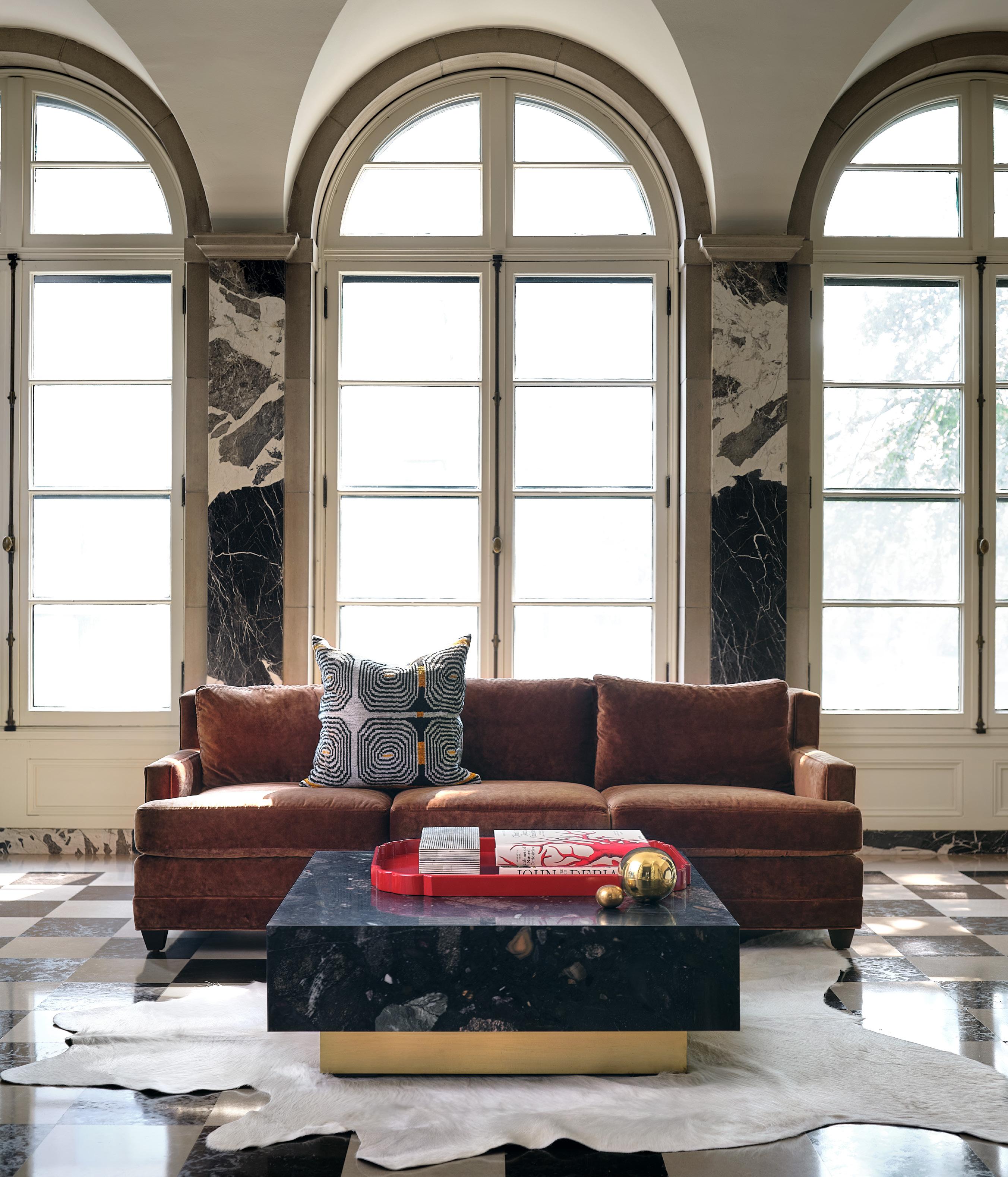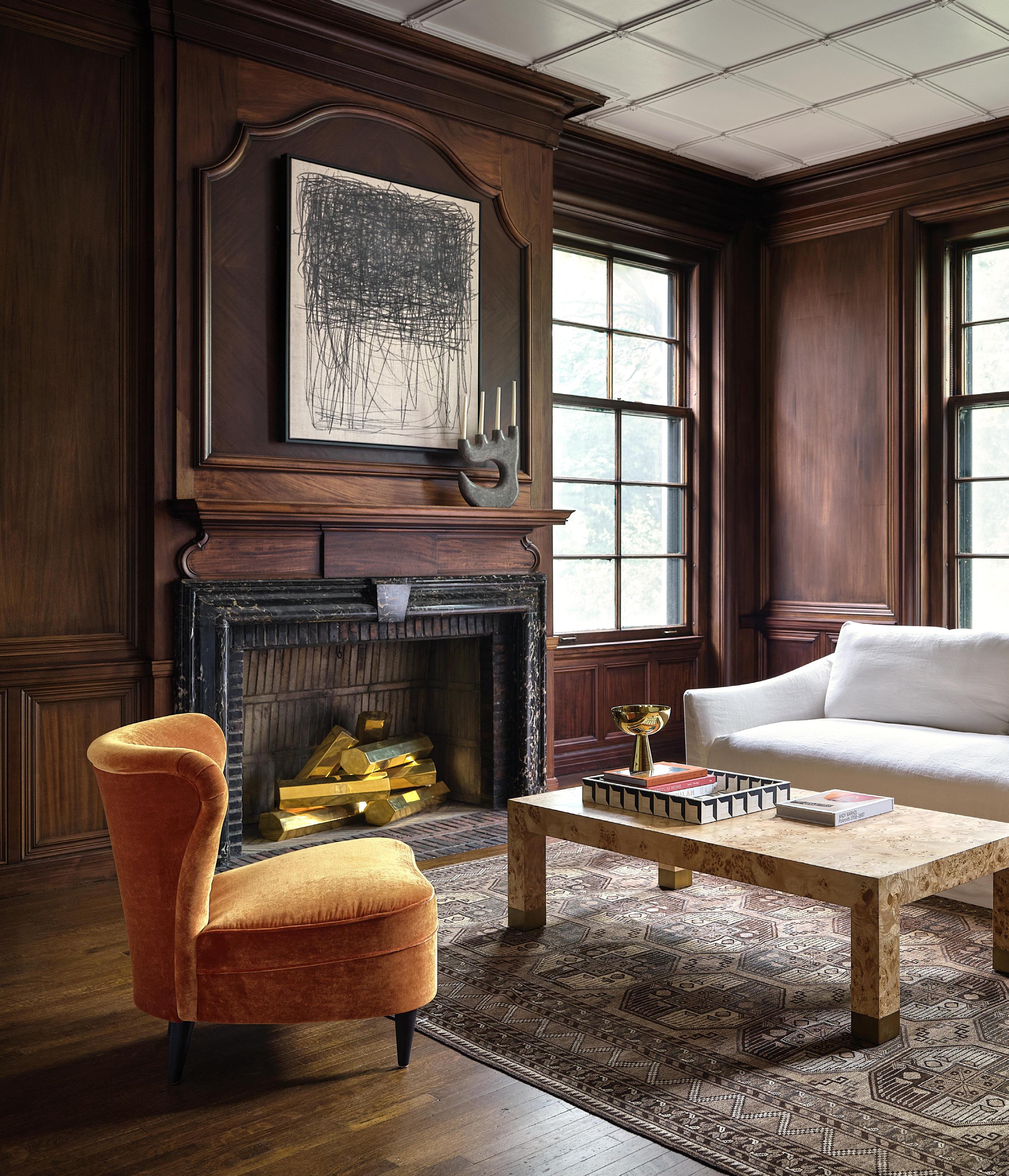 PIPPA CHAIR $1,995 luminous-terracotta velvet, black walnut wood finish • BROCKWAY COFFEE TABLE $1,795 burlwood veneer, brass • FITZ SOFA $5,995 slipcovered in creme linen • STATIC