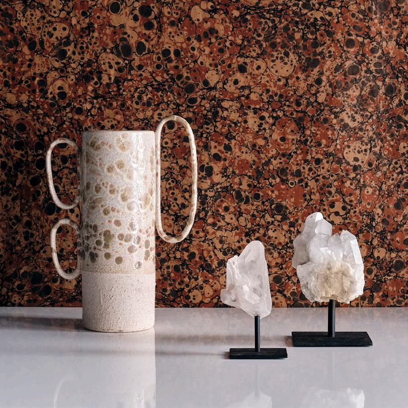 THIS PAGE: GISELLE CHAIR $1,295 uma-orange velvet, ebony-finished mahogany • KENTON SIDEBOARD $4,995 oak • THISBE SCULPTURE $298 quartz sand, polyresin • MORTIMER LAMP $495 glazed ceramic • GRANADA MIRROR $1,595 brass • JOAN MOBILE $3,495 blackened steel • OLGA COPPER RUG starting at $195 hand loomed wool, available in seven sizes OPPOSITE PAGE: JH LUME TAPER CANDLES $1795 EA set of two, handmade from a proprietary wax blend, available in eleven colors • GROTTO CANDELABRA $550 travertine • LAMBI SERVEWARE bowl $85 compote $125 glazed ceramic • IRMA VASES $34 - $48 textured ceramic • VINTAGE SUZANI TEXTILE $1,595 embroidered cotton