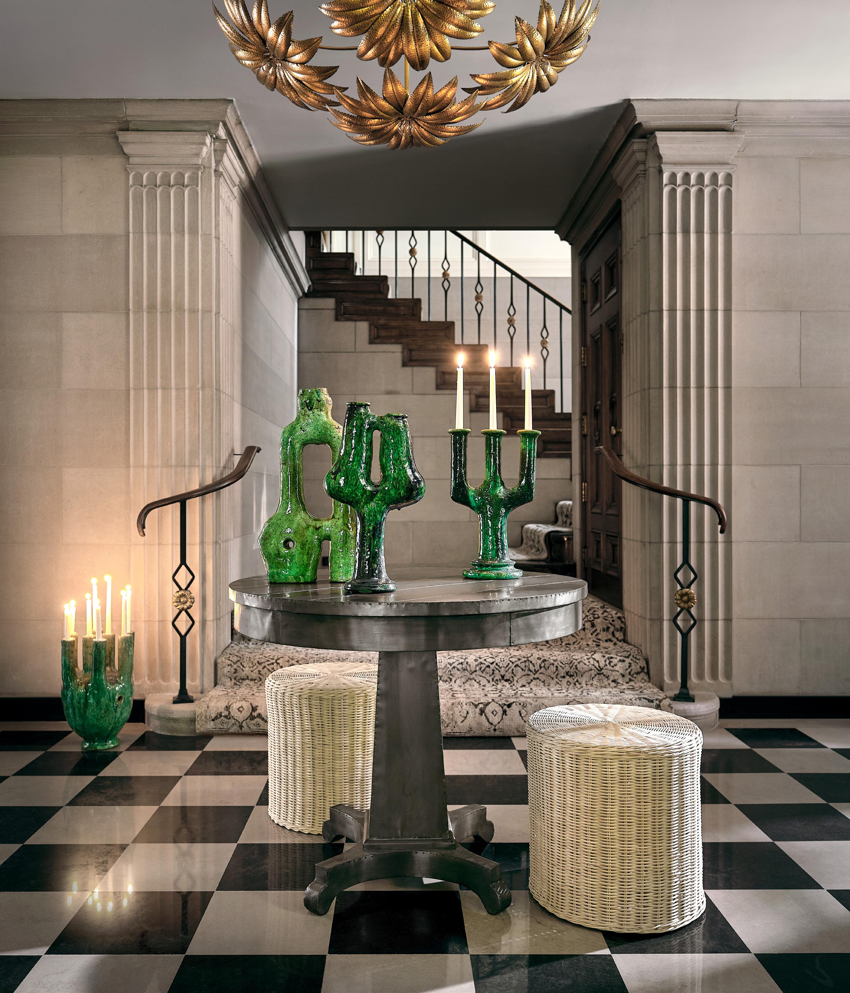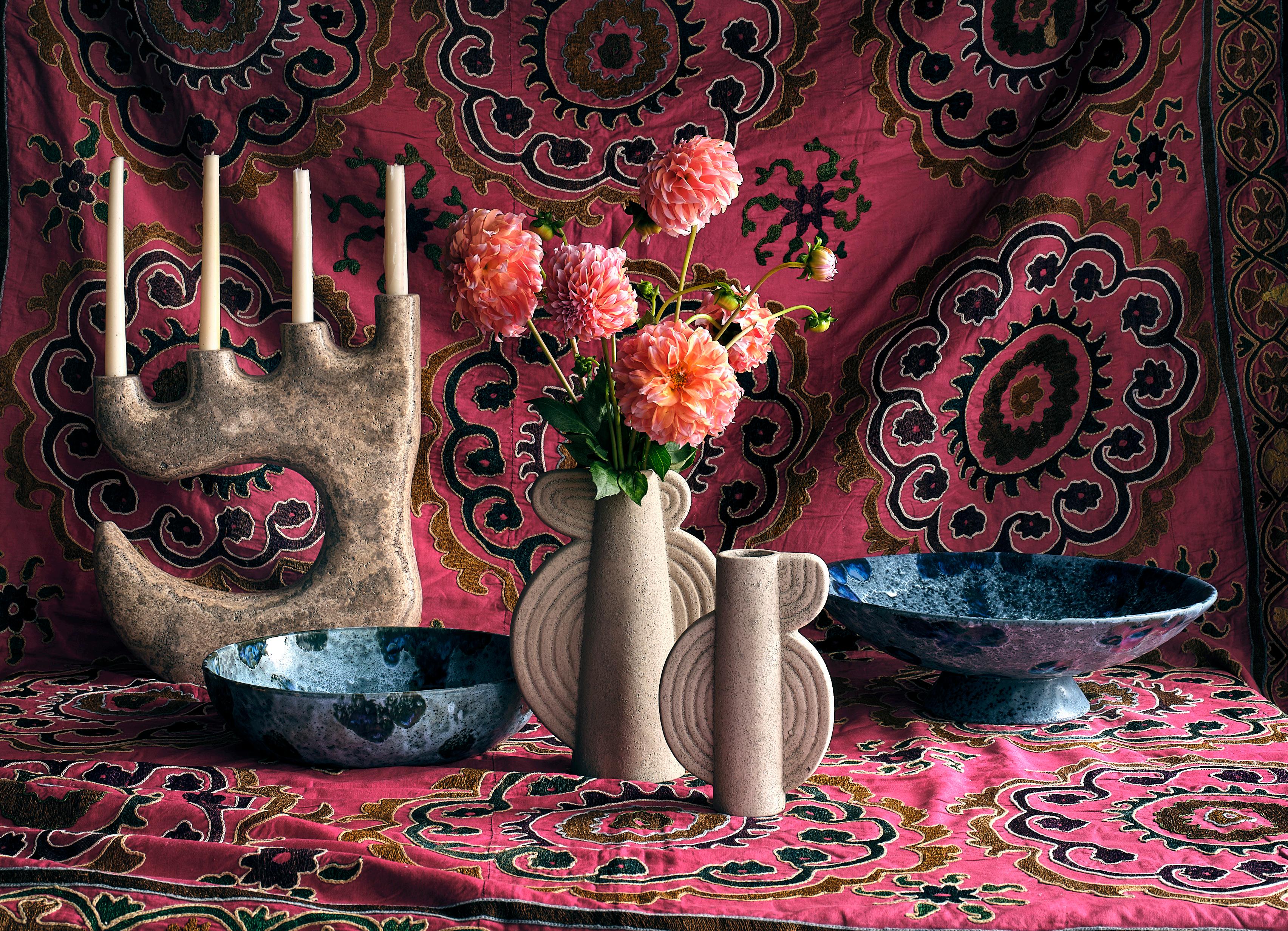 TABITHA VASE $295 hand painted ceramic • REAGAN TAPER HOLDERS $32 - $36 cast iron • NAYA COMPOTES