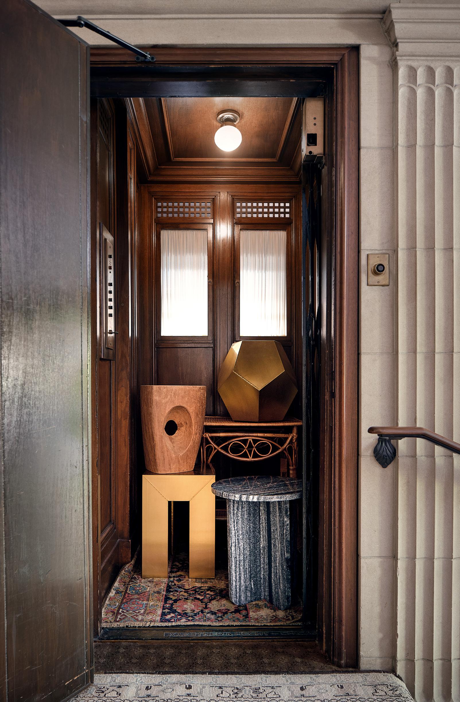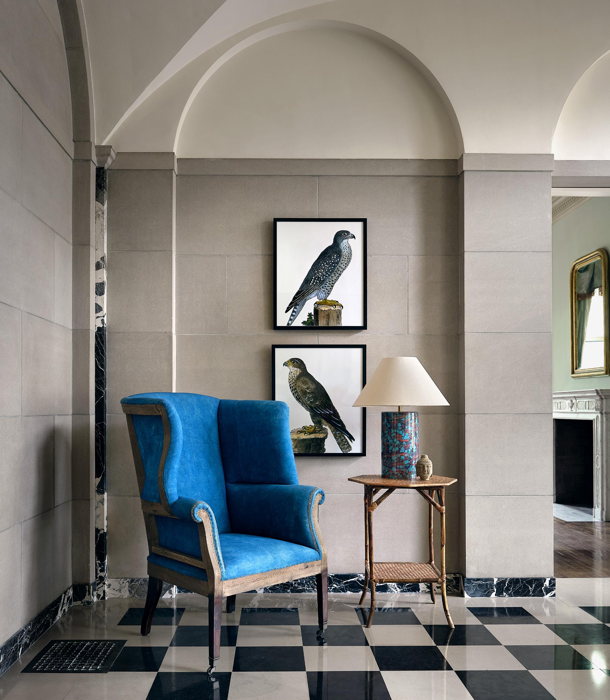 ARTWORK $1,395 giclée on canvas • GROTTO CANDELABRA $550 travertine • BRASS LOGS $395 EA • BRASS PEDESTAL BOWL $138