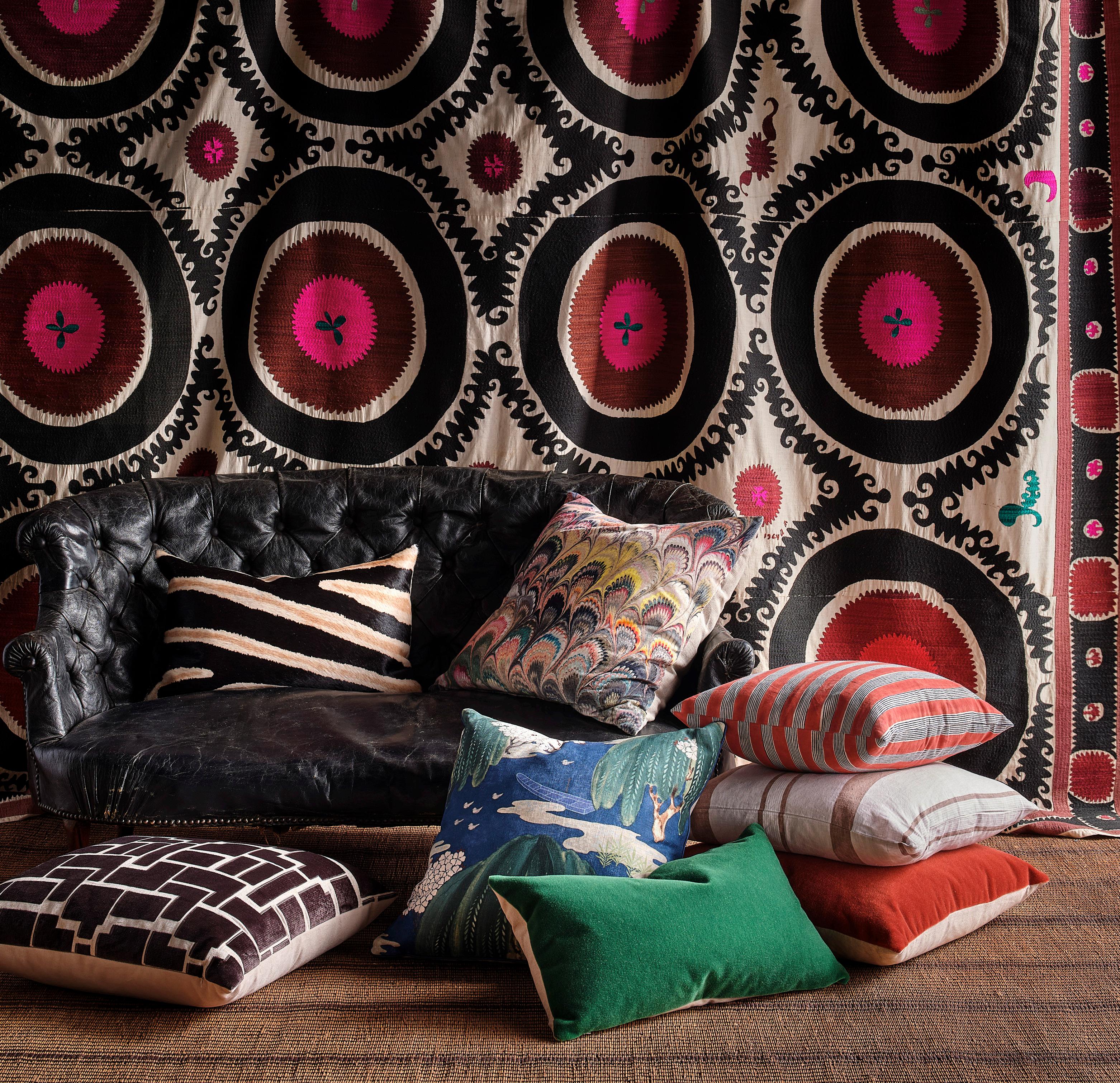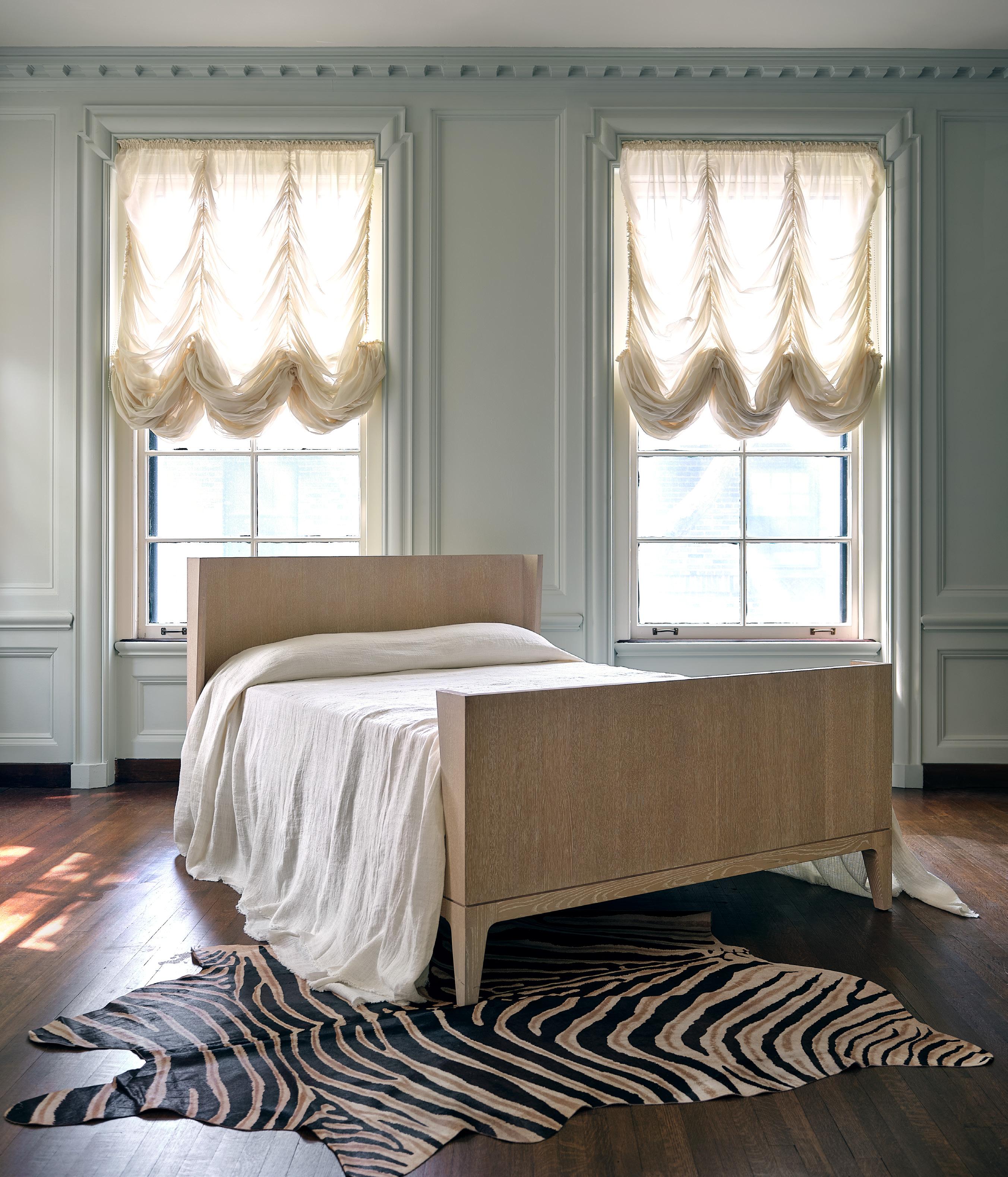 THIS PAGE: LABYRINTH CHARCOAL PILLOW $350 rayon, polyester and linen • FAUX ZEBRA PILLOW $295 stenciled cowhide • LOURDES PILLOW $495 cotton, viscose and polyester • KYOTO PILLOW $495 • viscose and linen • EMERALD MOHAIR PILLOW $250 • CHOPRA SCARLETT STRIPED PILLOW $250 block-printed linen • DURHAM PILLOW $195 linen • PERSIMMON MOHAIR PILLOW $325 VINTAGE SUZANI TEXTILE $2,095 embroidered cotton • TUAREG MAT $4,495 handwoven dwarf palm leaf fibers and goat leather OPPOSITE PAGE: FLETCHER BED queen $3,895 king $4,495 cerused oak • FENN BEDCOVER queen $295 king $350 linen, available in five colors • FAUX ZEBRA HIDE $995 stenciled cowhide