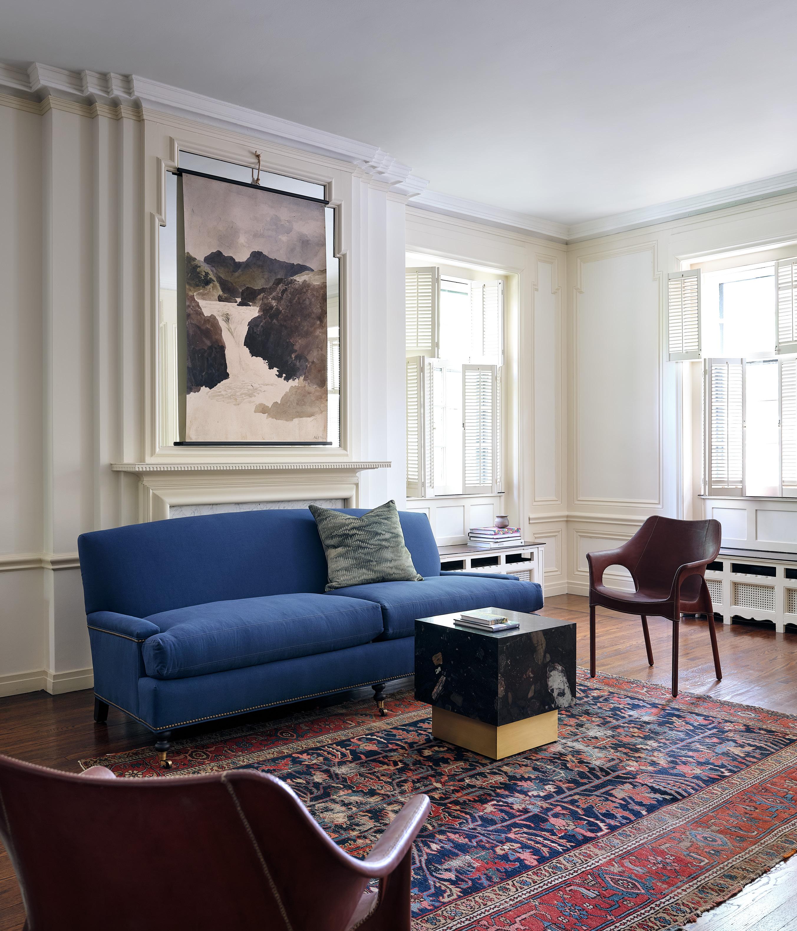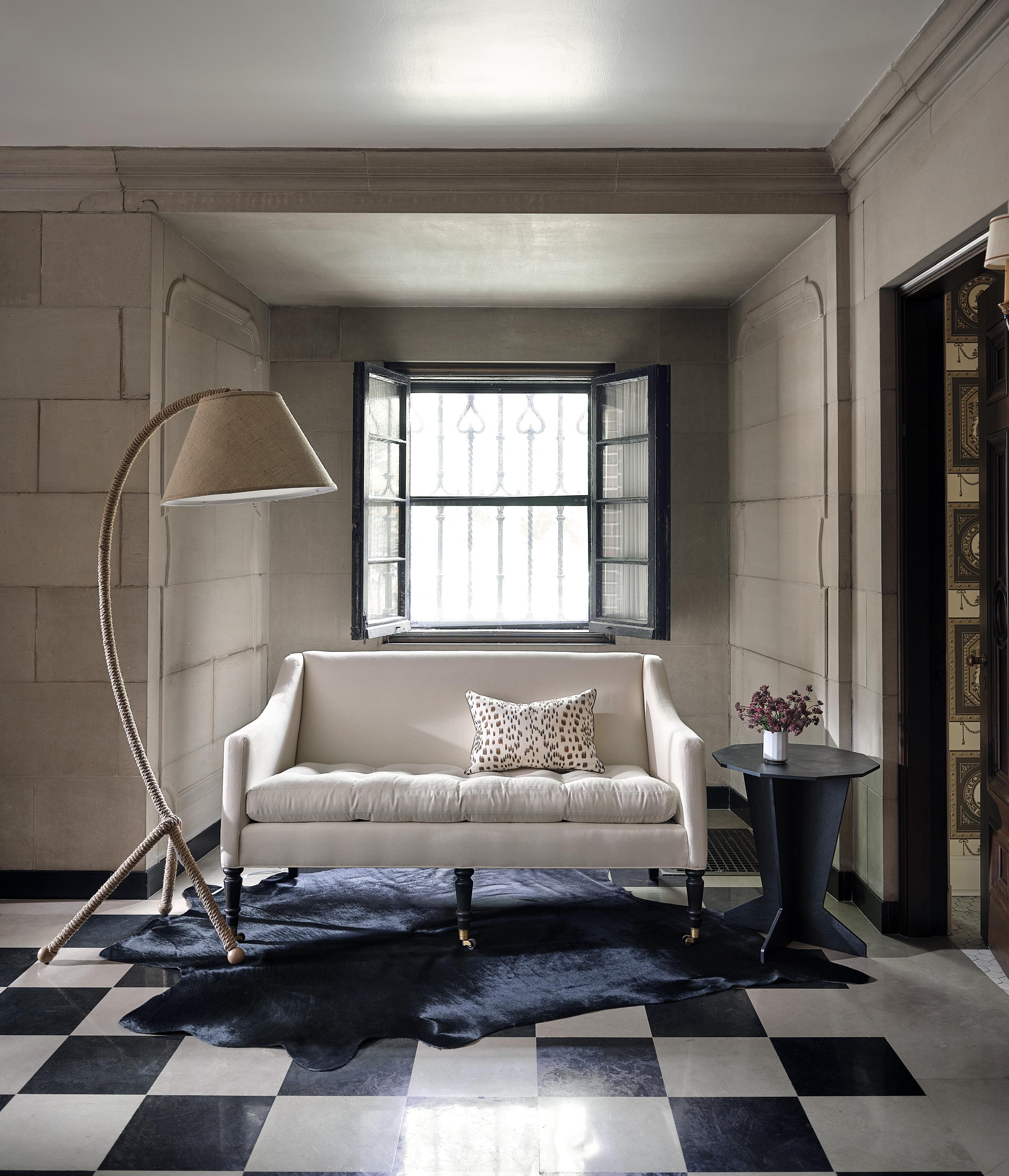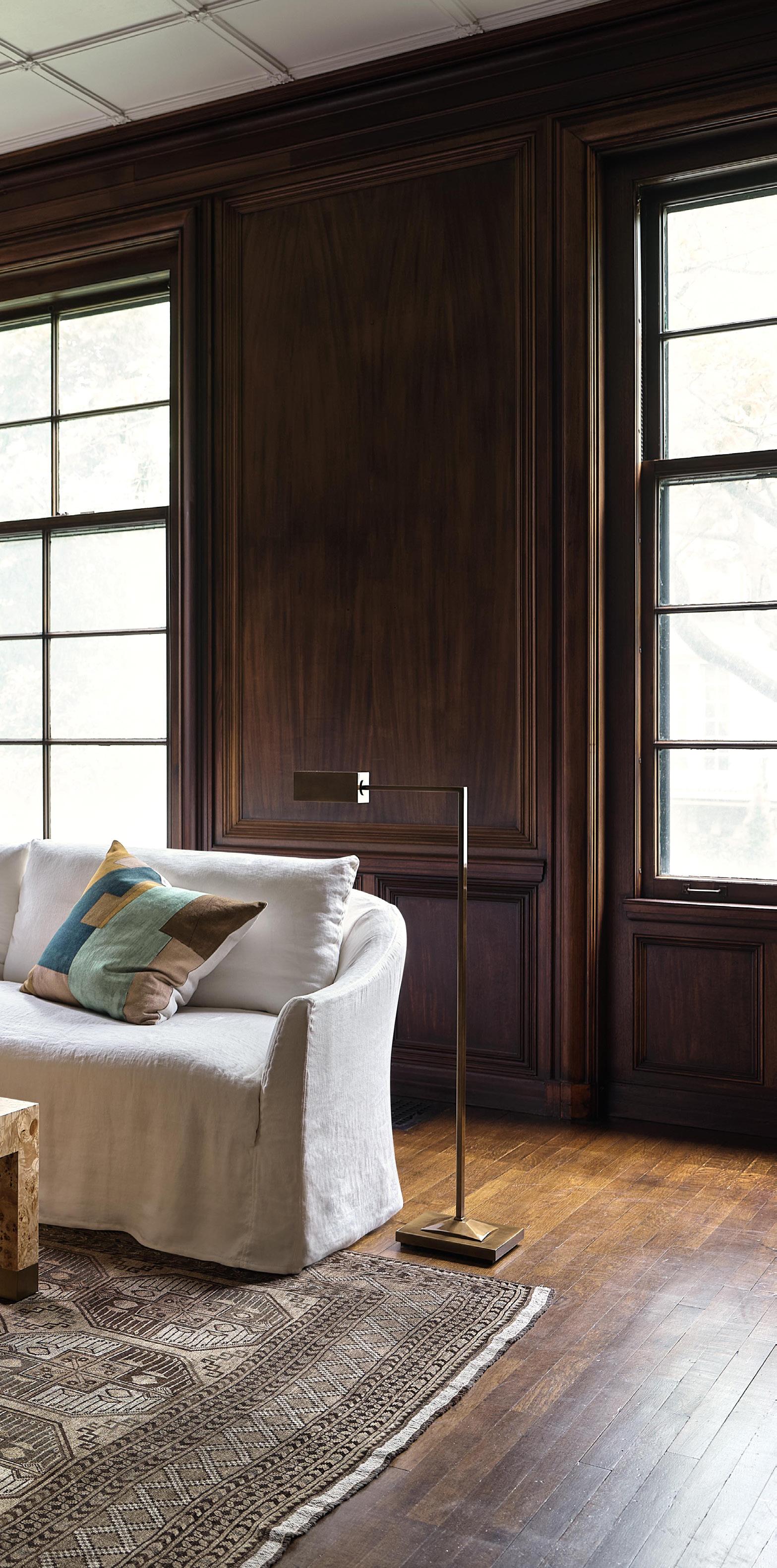 PIECE BLUE PILLOW $495 linen • LEIPZIG FLOOR LAMP $1,395 wrought iron, antiqued brass finish • VINTAGE AFGHAN RUG $9,750 handwoven and knotted wool