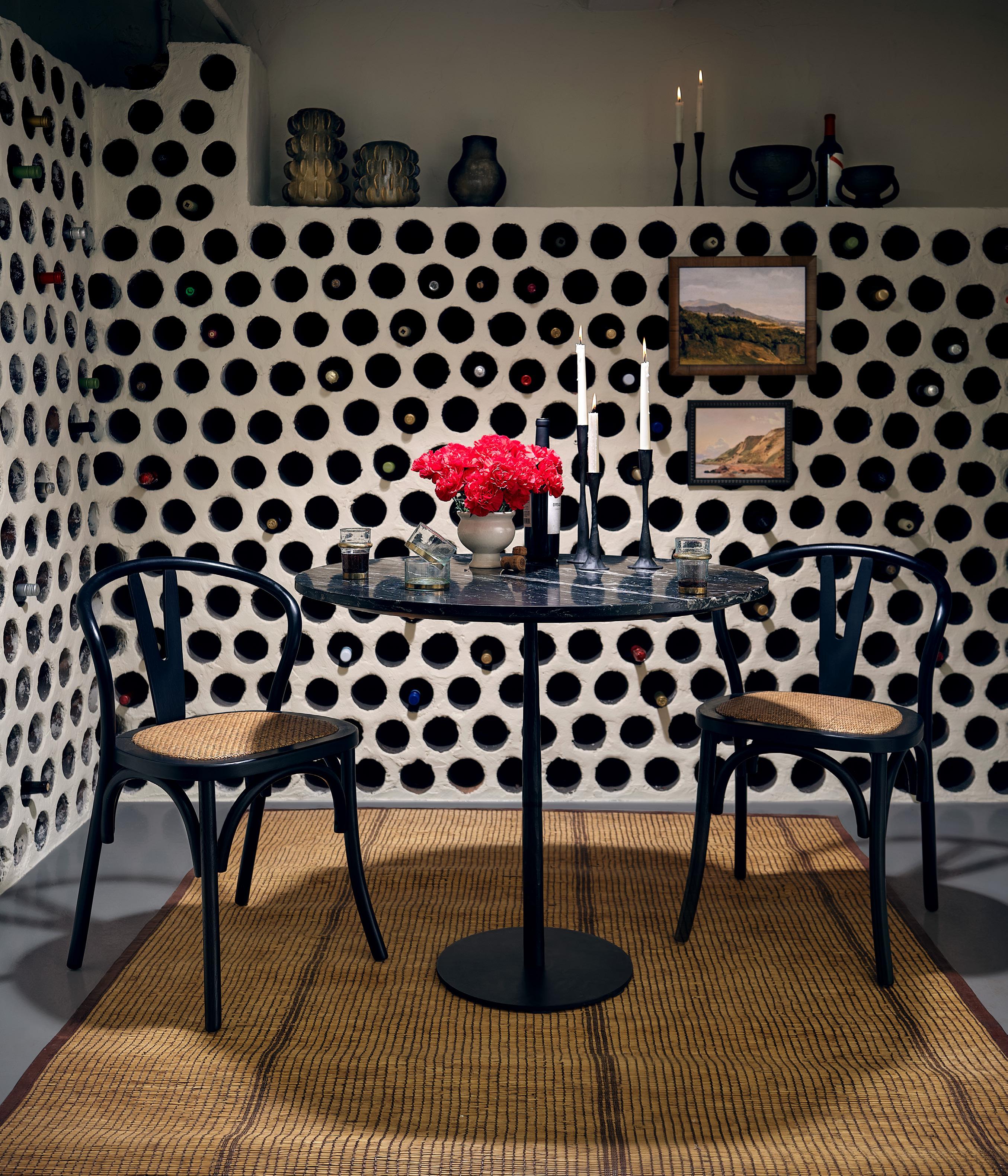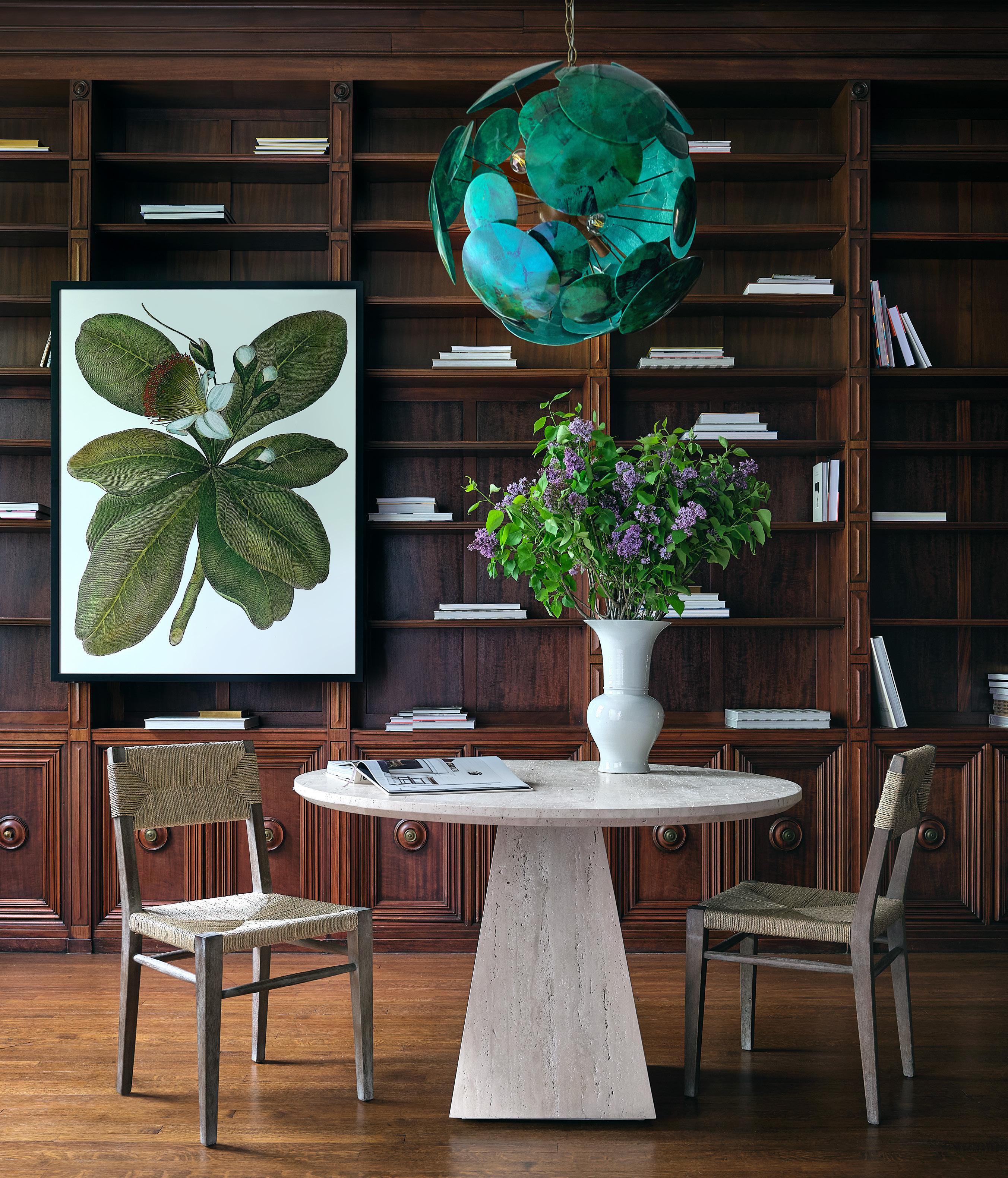 AMBROSE VOTIVES $28 - $32 hand blown glass, dried florals • NUEVO OIL CRUET $68 brass-finished stainless steel • TINY CAST ROUND BOWL $18 • CORBIN FOOTED BOWL $120 marble OPPOSITE PAGE: CAHILL DINING CHAIRS $395 EA seagrass, cerused rubber wood • TALLEY DINING TABLE $4,995 travertine • HERMIA VASE $275 glazed porcelain • BOTANIQUE ART $1,895 giclée • ANDROMEDA CHANDELIER $3,995 faux malachite, brass