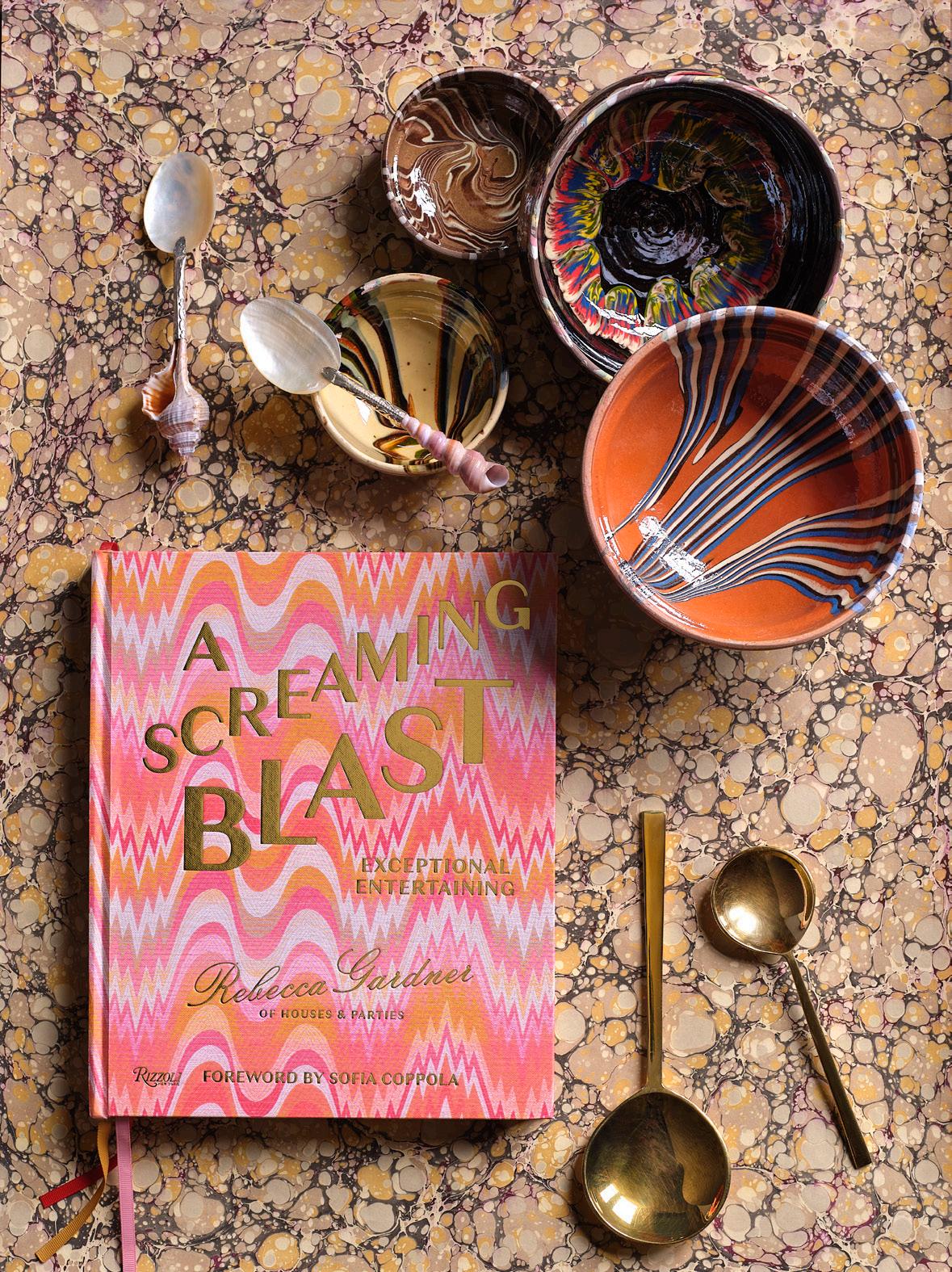 $160 papier-mâché • VINTAGE SUZANI TEXTILE $995 embroidered cotton BOTTOM: SHELL SPOONS $18 EA IRINA BOWLS $38 - $58 glazed ceramic • BRASS SPOONS $24 - $32 • A SCREAMING BLAST: EXCEPTIONAL ENTERTAINING $45 OPPOSITE PAGE: INGRID TABLE $1,395 black marble, iron • DOROTHY DINING CHAIRS $395 EA rattan, ebony-finished beech wood • SHOSHANA VASES $85 - $162 glazed ceramic