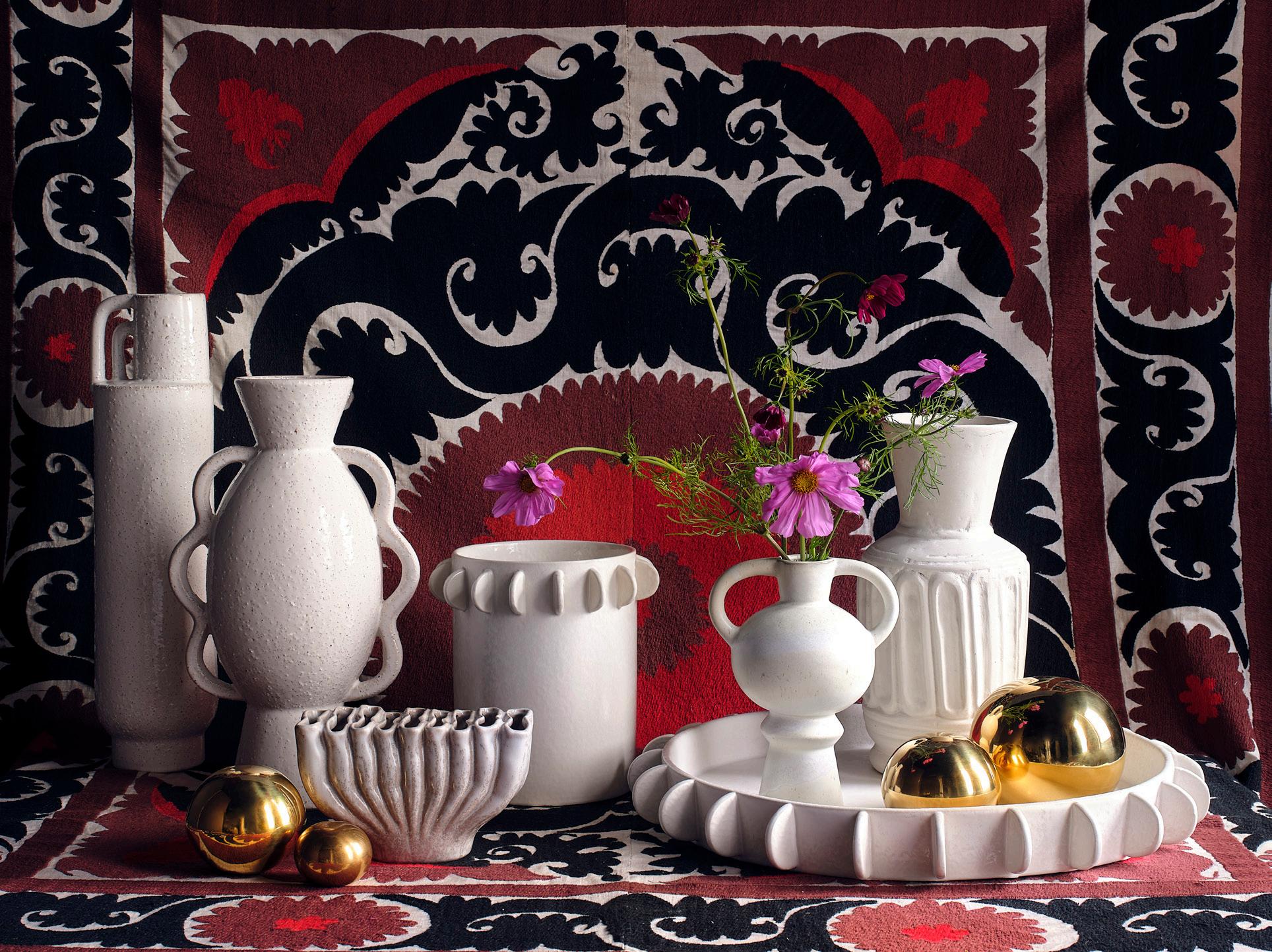 TOP: MINORCA VASE $198 glazed ceramic • MONIQUE VASE $275 glazed ceramic • GAMMA ORBS $38 - $88 brass • FAIRFORD VASE $45 glazed ceramic • OXNARD CERAMICS vessel $120 tray $350 glazed ceramic