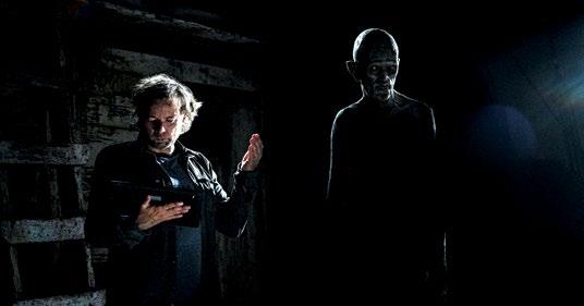 MONSTER MAGIC: Aaron Sims Creative and the ILM art department were on board to help visualize the transformations of Dracula in the movie. Right: Director André Øvredal on set with actor Javier Botet in full prosthetics. (Photo: Rainer Bajo/Universal Pictures and Amble Ent.)