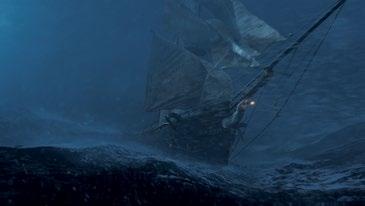 Avoiding the size and scale issues that would make the Demeter appear as a miniature was extremely difficult. “We went through a trialand-error phase on the size of wavelets on top of big waves,” reveals Parker. “We had LiDAR of the ship so we knew how large that was and had a general sense of the size of the storm and the big rolling waves that we might create. But it comes down to the wavelets and micro wavelets within those that give you a sense of true scale of water. We came up with this recipe that in most cases would make it look believable. It’s the same thing with atmosphere in a big open world like that. When you have a set and then the entire world around it is this massive overcast environment, playing with the